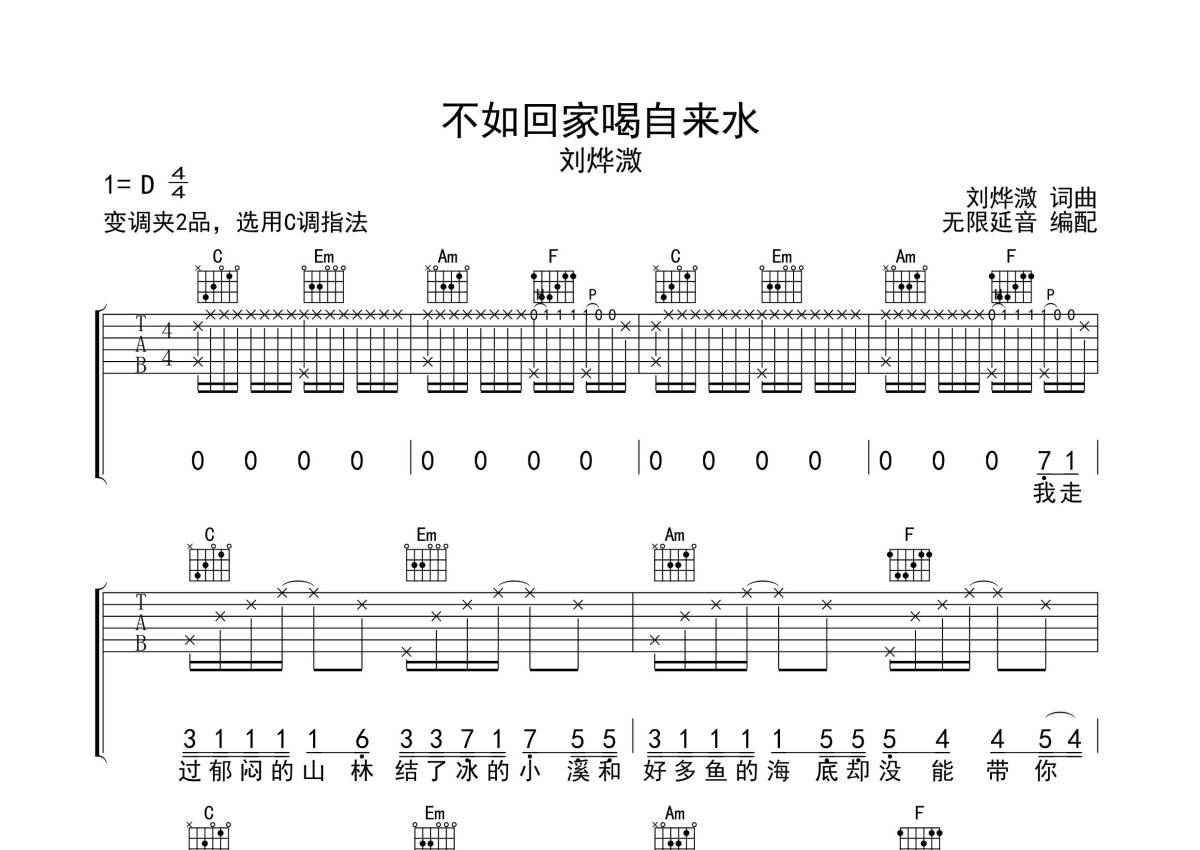 《不如回家喝自来水》吉他谱 - 刘烨溦 - C调弹唱六线谱