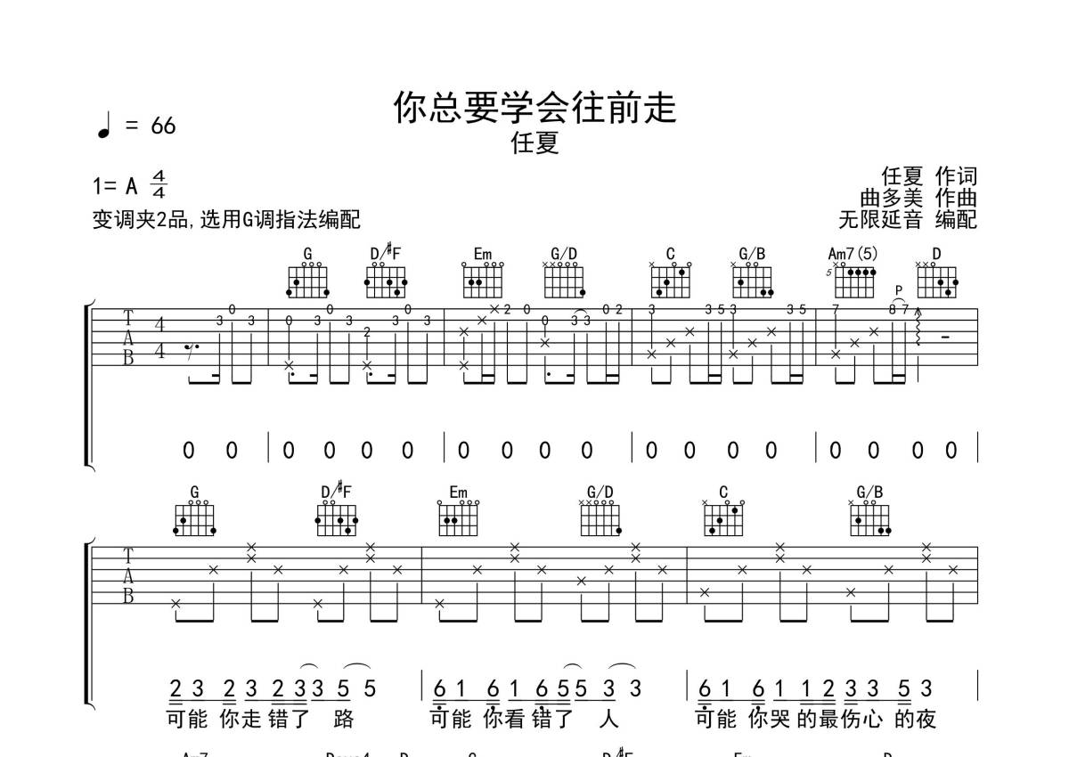《你总要学会往前走》是任夏演唱的一首歌曲,拍号为4/4拍,歌曲速度为每分钟66拍,歌曲原调为A调,但由于原调指法比较难,为了方便弹奏,本吉他谱采用的是G调指法编配,变调夹2品弹奏即为原调,当然也可以根据自己的音域改变变调夹位置,或者通过改变和弦调性,以方便自己弹奏,这份吉他谱共有两张高清图谱,图谱由 @无限延音 编配上传,图谱使用六线谱编配,包含吉他和弦指法、简谱以及歌词部分,使用这份你总要学会往前走吉他谱,可以让你更加方便地掌握这首歌曲的弹唱技巧,快来尝试吧。
