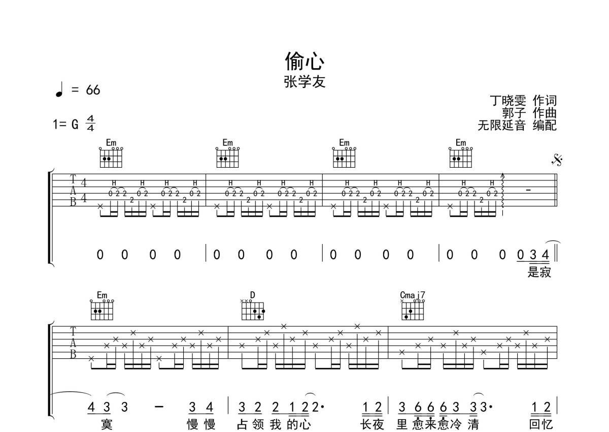 《偷心》是张学友演唱的一首歌曲,拍号为4/4拍,歌曲速度为每分钟66拍,歌曲原调为G调,本吉他谱采用的是G调指法编配,演奏时不需要使用变调夹即为原调,这份吉他谱共有三张高清图谱,图谱由 @无限延音 编配上传,图谱使用六线谱编配,包含吉他和弦指法、简谱以及歌词部分,使用这份偷心吉他谱,可以让你更加方便地掌握这首歌曲的弹唱技巧,快来尝试吧。