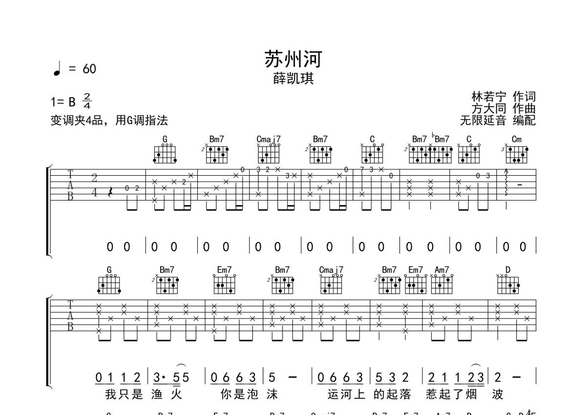 《苏州河》是薛凯琪演唱的一首歌曲,拍号为2/4拍,歌曲速度为每分钟60拍,歌曲原调为B调,但由于原调指法比较难,为了方便弹奏,本吉他谱采用的是G调指法编配,变调夹4品弹奏即为原调,当然也可以根据自己的音域改变变调夹位置,或者通过改变和弦调性,以方便自己弹奏,这份吉他谱共有三张高清图谱,图谱由 @无限延音 编配上传,图谱使用六线谱编配,包含吉他和弦指法、简谱以及歌词部分,使用这份苏州河吉他谱,可以让你更加方便地掌握这首歌曲的弹唱技巧,快来尝试吧。
