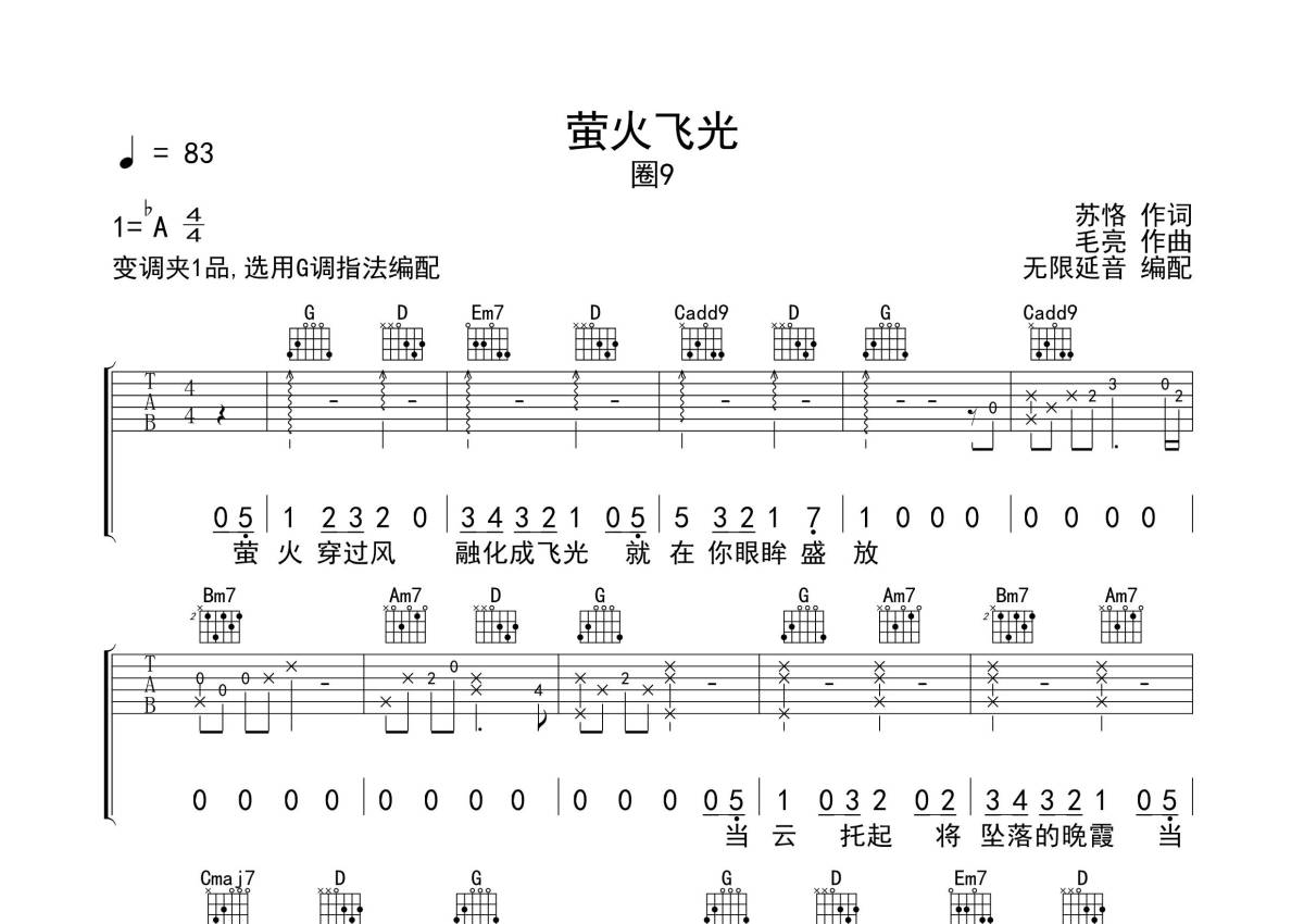 《萤火飞光》是圈9演唱的一首歌曲,拍号为4/4拍,歌曲速度为每分钟83拍,歌曲原调为Ab调,但由于原调指法比较难,为了方便弹奏,本吉他谱采用的是G调指法编配,变调夹1品弹奏即为原调,当然也可以根据自己的音域改变变调夹位置,或者通过改变和弦调性,以方便自己弹奏,这份吉他谱共有四张高清图谱,图谱由 @无限延音 编配上传,图谱使用六线谱编配,包含吉他和弦指法、简谱以及歌词部分,使用这份萤火飞光吉他谱,可以让你更加方便地掌握这首歌曲的弹唱技巧,快来尝试吧。