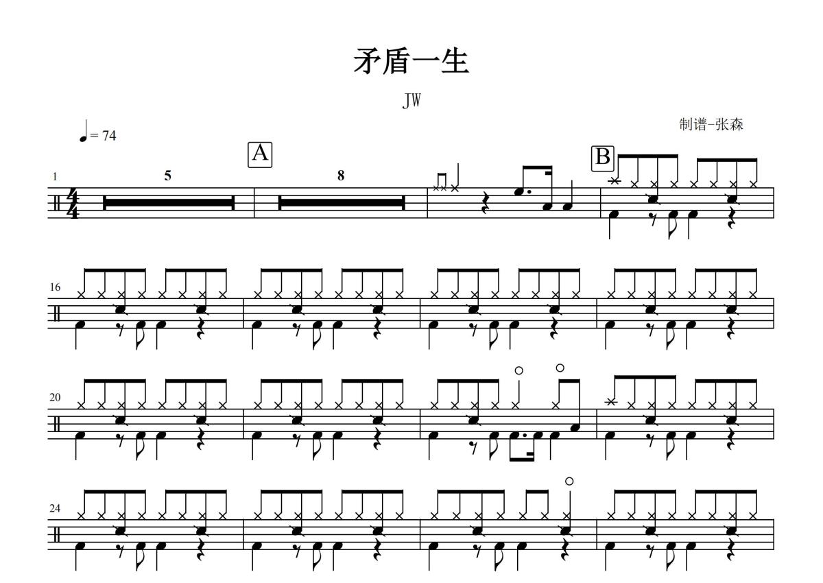 《矛盾一生》是JW演唱的一首歌曲,这份鼓谱共有两张高清图谱,图谱由 @打鼓谱 编配上传,图谱使用五线谱编配,使用这份矛盾一生架子鼓谱,你将能够轻松地敲打出这首JW的矛盾一生,快来尝试吧。《矛盾一生》是JW演唱的歌曲,所属专辑是《矛盾一生》,2015年发行。