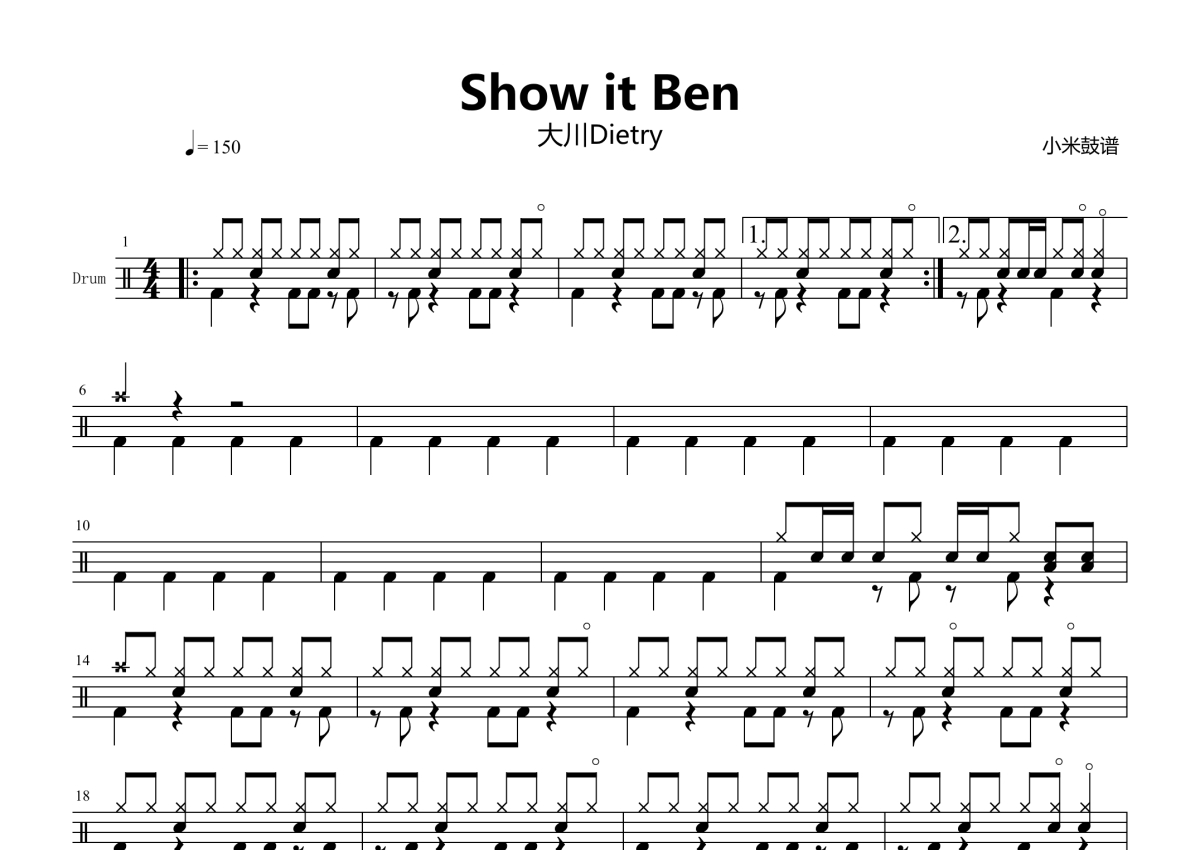 《Show it Ben》是大川Dietry演唱的一首歌曲,拍号为4/4拍,歌曲速度为每分钟150拍,这份架子鼓谱共有两张高清图谱,图谱由 @小米鼓谱 编配上传,图谱使用五线谱编配,使用这份Show it Ben架子鼓谱,你将能够轻松地敲打出这首大川Dietry的Show it Ben,快来尝试吧。