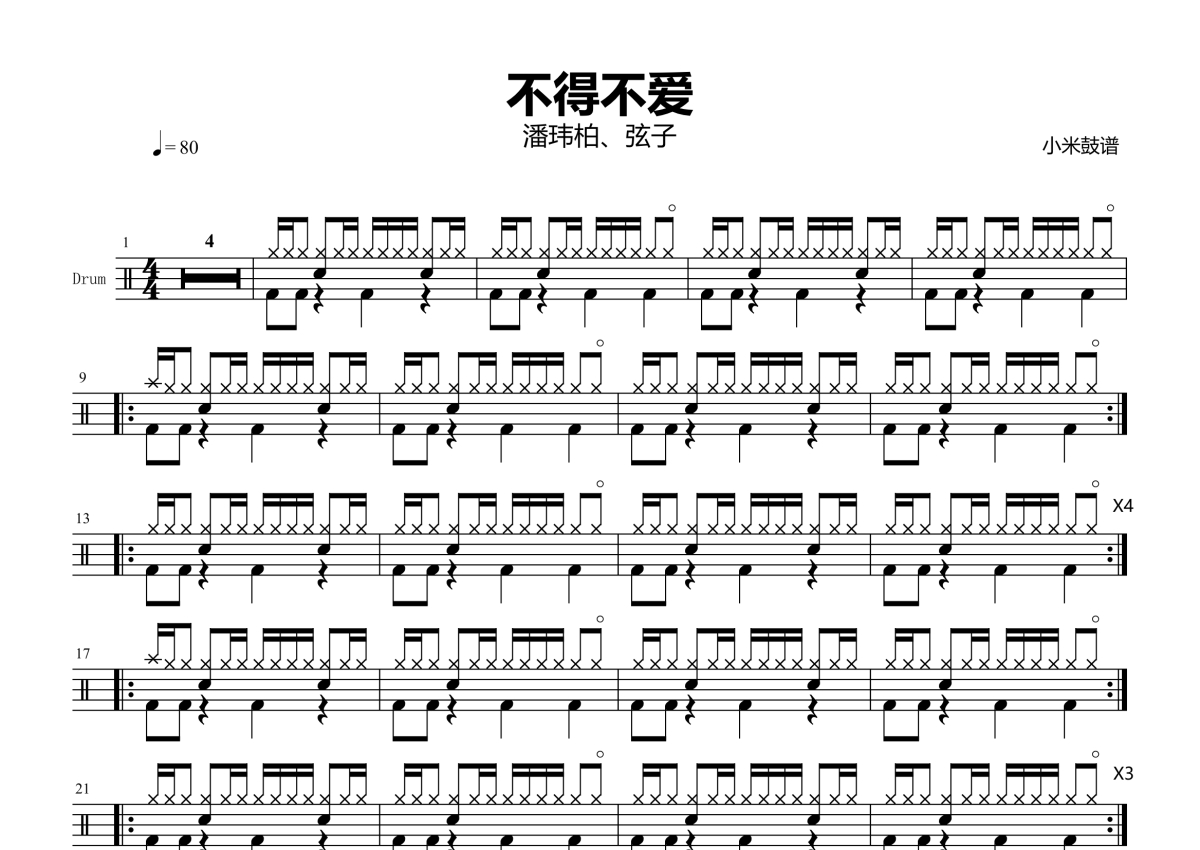 《不得不爱》是潘玮柏、弦子演唱的一首歌曲,拍号为4/4拍,歌曲速度为每分钟80拍,这份架子鼓谱共有两张高清图谱,图谱由 @小米鼓谱 编配上传,图谱使用五线谱编配,使用这份不得不爱架子鼓谱,你将能够轻松地敲打出这首潘玮柏、弦子的不得不爱,快来尝试吧。