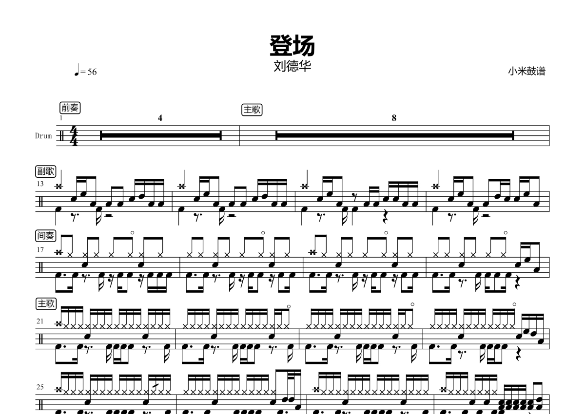 《登场》是刘德华演唱的一首歌曲,拍号为4/4拍,歌曲速度为每分钟56拍,这份架子鼓谱共有一张高清图谱,图谱由 @小米鼓谱 编配上传,图谱使用五线谱编配,使用这份登场架子鼓谱,你将能够轻松地敲打出这首刘德华的登场,快来尝试吧。
