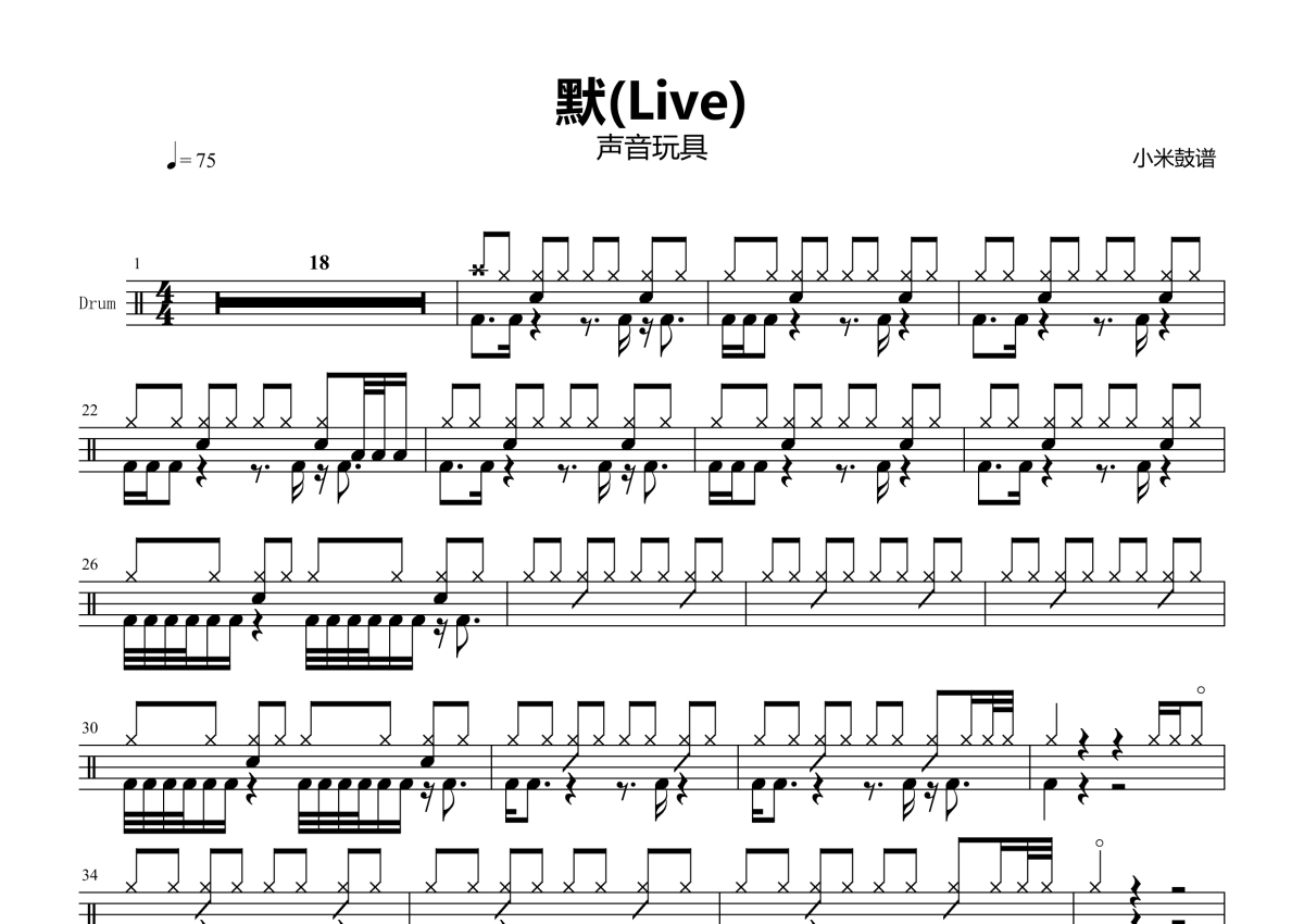 《默》是声音玩具演唱的一首歌曲,Live,拍号为4/4拍,歌曲速度为每分钟75拍,这份架子鼓谱共有两张高清图谱,图谱由 @小米鼓谱 编配上传,图谱使用五线谱编配,使用这份默架子鼓谱,你将能够轻松地敲打出这首声音玩具的默,快来尝试吧。