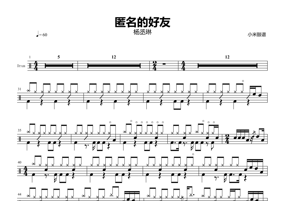 《匿名的好友》是杨丞琳演唱的一首歌曲,拍号为4/4拍,歌曲速度为每分钟60拍,这份架子鼓谱共有一张高清图谱,图谱由 @小米鼓谱 编配上传,图谱使用五线谱编配,使用这份匿名的好友架子鼓谱,你将能够轻松地敲打出这首杨丞琳的匿名的好友,快来尝试吧。