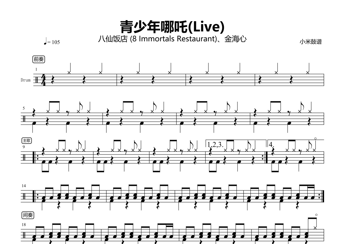 《青少年哪吒》是八仙饭店 (8 Immortals Restaurant)、金海心演唱的一首歌曲,Live,拍号为4/4拍,歌曲速度为每分钟105拍,这份架子鼓谱共有两张高清图谱,图谱由 @小米鼓谱 编配上传,图谱使用五线谱编配,使用这份青少年哪吒架子鼓谱,你将能够轻松地敲打出这首八仙饭店 (8 Immortals Restaurant)、金海心的青少年哪吒,快来尝试吧。
