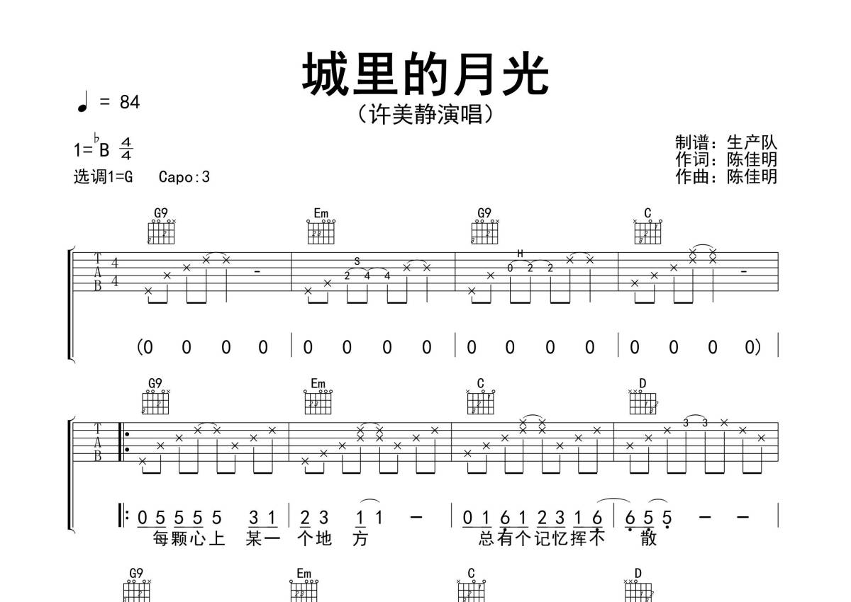 许美静《城里的月光》吉他谱 - G调弹唱六线谱 - 精编完美版