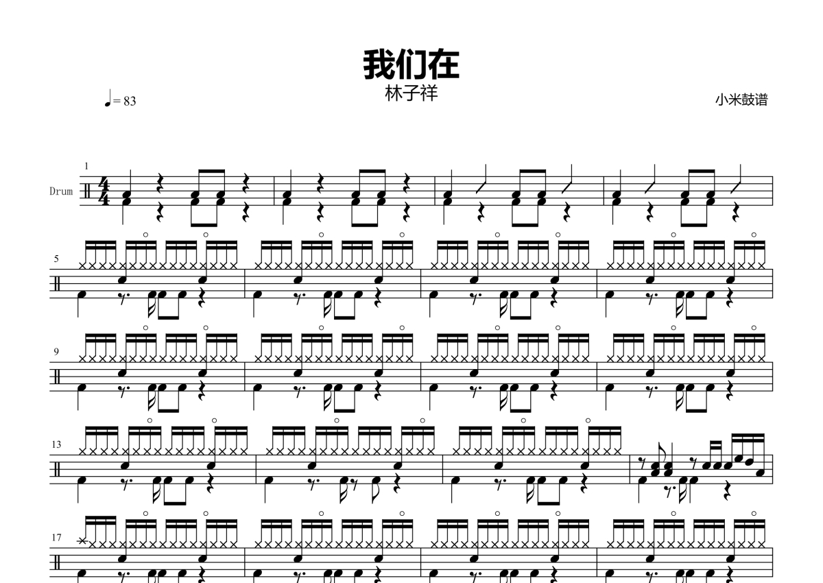 《我们在》是林子祥演唱的一首歌曲,拍号为4/4拍,歌曲速度为每分钟83拍,这份架子鼓谱共有两张高清图谱,图谱由 @小米鼓谱 编配上传,图谱使用五线谱编配,使用这份我们在架子鼓谱,你将能够轻松地敲打出这首林子祥的我们在,快来尝试吧。