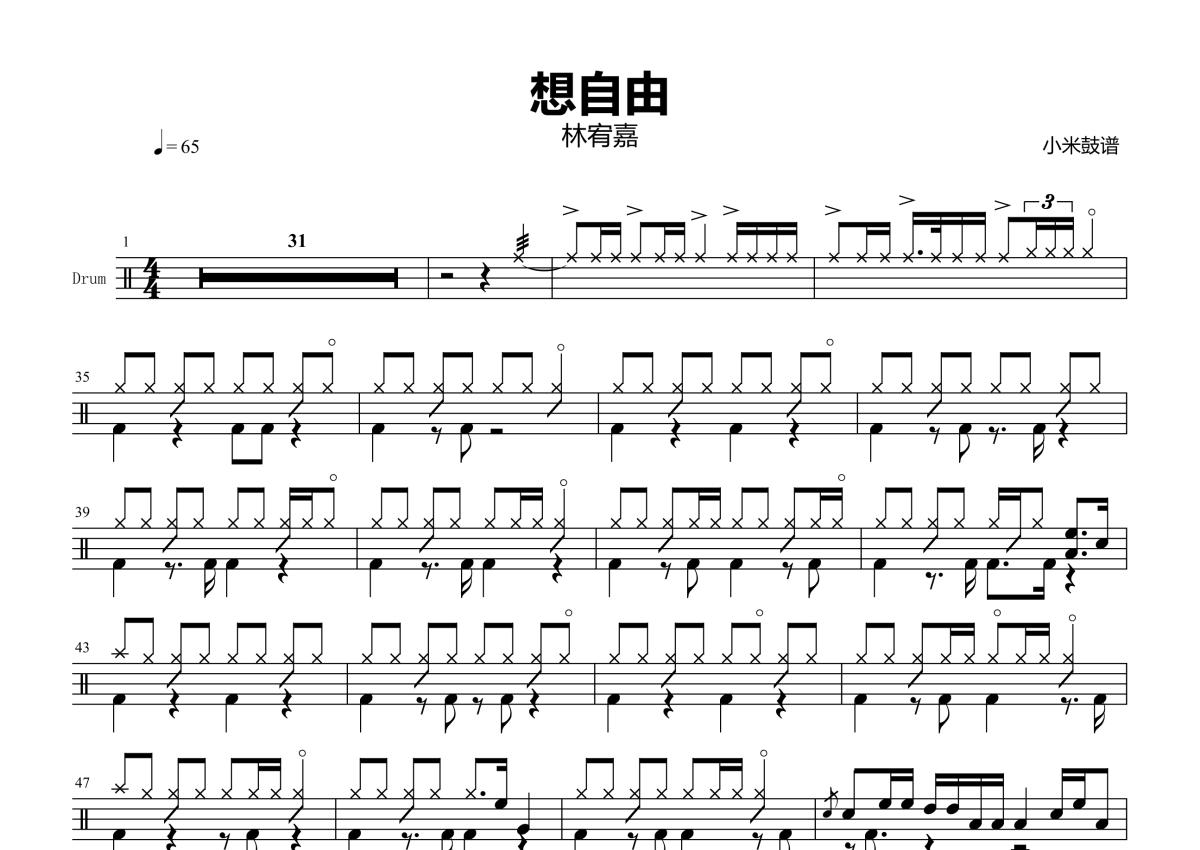 《想自由》是林宥嘉演唱的一首歌曲,拍号为4/4拍,歌曲速度为每分钟65拍,这份架子鼓谱共有一张高清图谱,图谱由 @小米鼓谱 编配上传,图谱使用五线谱编配,使用这份想自由架子鼓谱,你将能够轻松地敲打出这首林宥嘉的想自由,快来尝试吧。