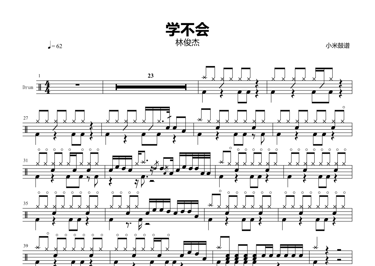 《学不会》是林俊杰演唱的一首歌曲,拍号为4/4拍,歌曲速度为每分钟62拍,这份架子鼓谱共有一张高清图谱,图谱由 @小米鼓谱 编配上传,图谱使用五线谱编配,使用这份学不会架子鼓谱,你将能够轻松地敲打出这首林俊杰的学不会,快来尝试吧。