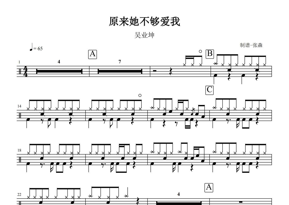 《原来她不够爱我》是吴业坤演唱的一首歌曲,这份鼓谱共有两张高清图谱,图谱由 @打鼓谱 编配上传,图谱使用五线谱编配,使用这份原来她不够爱我架子鼓谱,你将能够轻松地敲打出这首吴业坤的原来她不够爱我,快来尝试吧。《原来她不够爱我》是由林若宁作词,Larry Wong作曲,香港男歌手吴业坤演唱的粤语歌曲,表达了男主内心对女主的爱、理解与不舍的纠结心理。正式发行于2015年4月22日。
