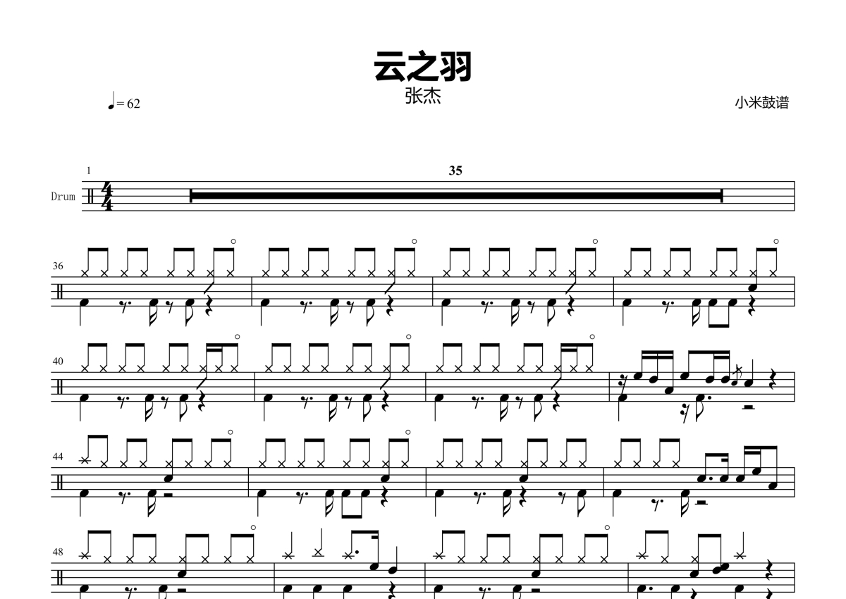 《云之羽》是张杰演唱的一首歌曲,拍号为4/4拍,歌曲速度为每分钟62拍,这份架子鼓谱共有一张高清图谱,图谱由 @小米鼓谱 编配上传,图谱使用五线谱编配,使用这份云之羽架子鼓谱,你将能够轻松地敲打出这首张杰的云之羽,快来尝试吧。