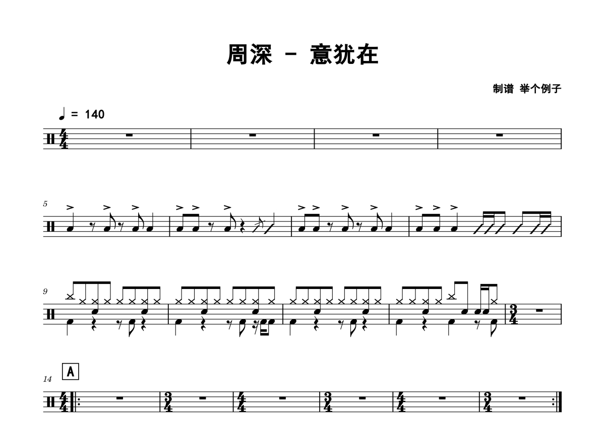 《意犹在》是周深演唱的一首歌曲,拍号为4/4拍,歌曲速度为每分钟140拍,这份架子鼓谱共有两张高清图谱,图谱由 @老虎不说谎 编配上传,图谱使用五线谱编配,使用这份意犹在架子鼓谱,你将能够轻松地敲打出这首周深的意犹在,快来尝试吧。