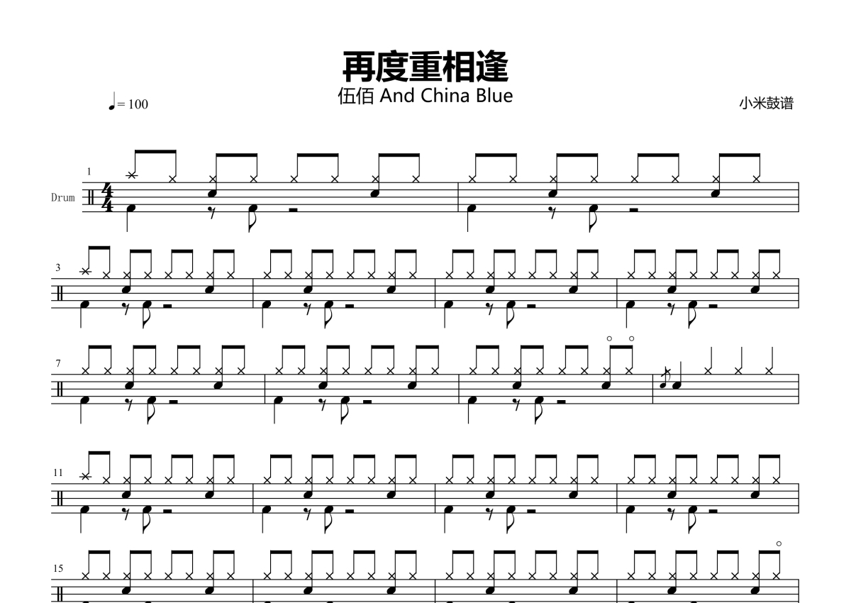 《再度重相逢》是伍佰演唱的一首歌曲,拍号为4/4拍,歌曲速度为每分钟100拍,这份架子鼓谱共有两张高清图谱,图谱由 @小米鼓谱 编配上传,图谱使用五线谱编配,使用这份再度重相逢架子鼓谱,你将能够轻松地敲打出这首伍佰的再度重相逢,快来尝试吧。