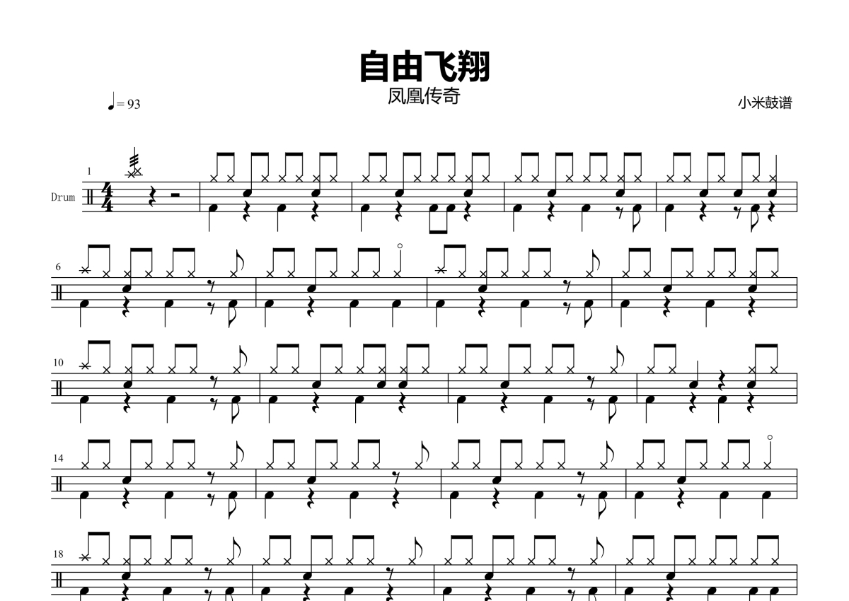 《自由飞翔》是凤凰传奇演唱的一首歌曲,拍号为4/4拍,歌曲速度为每分钟93拍,这份架子鼓谱共有三张高清图谱,图谱由 @小米鼓谱 编配上传,图谱使用五线谱编配,使用这份自由飞翔架子鼓谱,你将能够轻松地敲打出这首凤凰传奇的自由飞翔,快来尝试吧。
