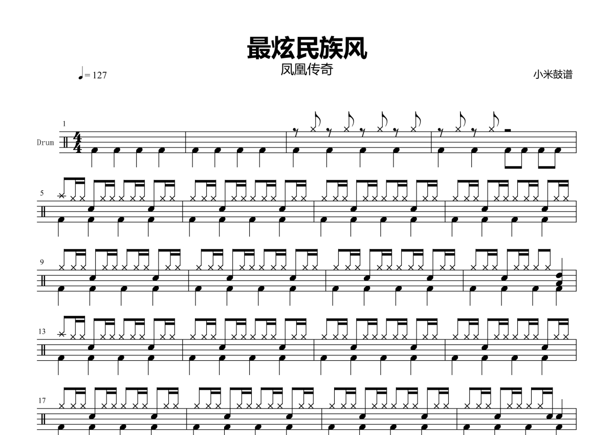 《最炫民族风》是凤凰传奇演唱的一首歌曲,拍号为4/4拍,歌曲速度为每分钟127拍,这份架子鼓谱共有三张高清图谱,图谱由 @小米鼓谱 编配上传,图谱使用五线谱编配,使用这份最炫民族风架子鼓谱,你将能够轻松地敲打出这首凤凰传奇的最炫民族风,快来尝试吧。