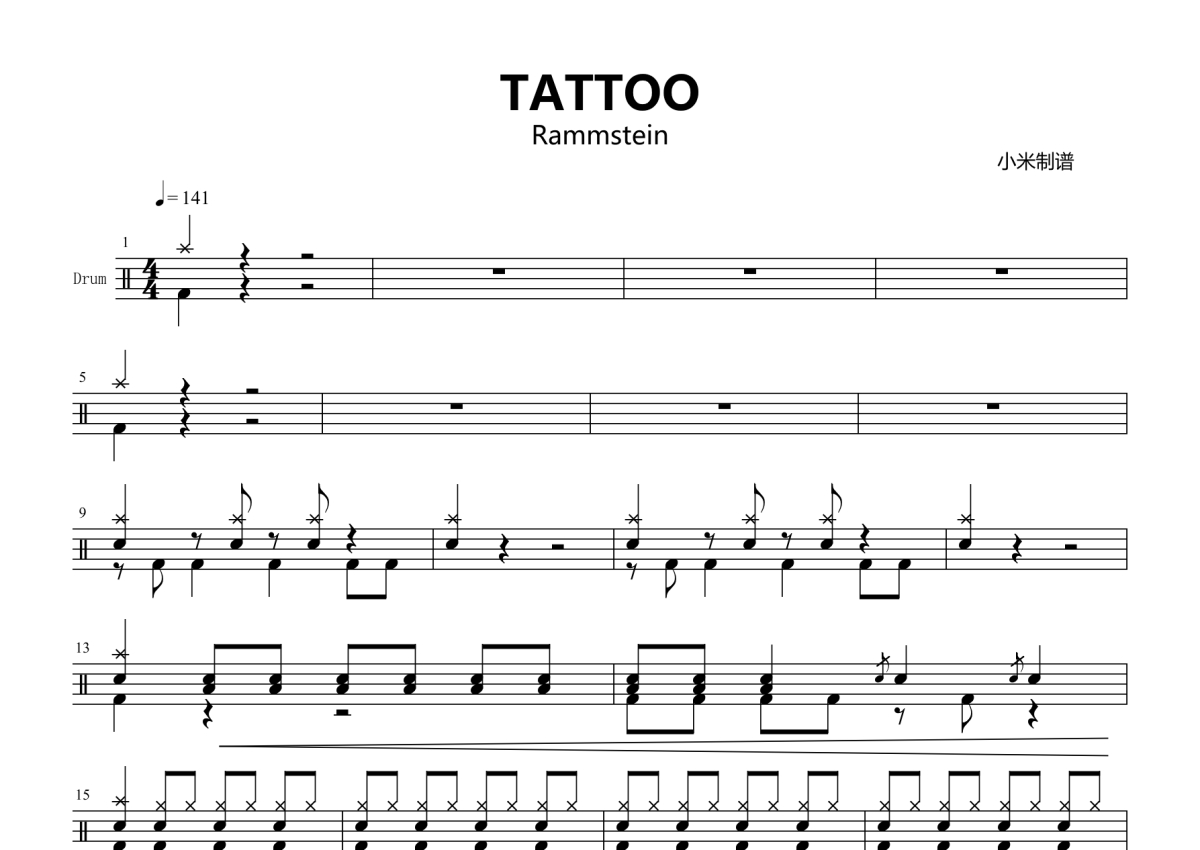 《TATTOO》是Rammstein演唱的一首歌曲,拍号为4/4拍,歌曲速度为每分钟141拍,这份架子鼓谱共有四张高清图谱,图谱由 @小米鼓谱 编配上传,图谱使用五线谱编配,使用这份TATTOO架子鼓谱,你将能够轻松地敲打出这首Rammstein的TATTOO,快来尝试吧。