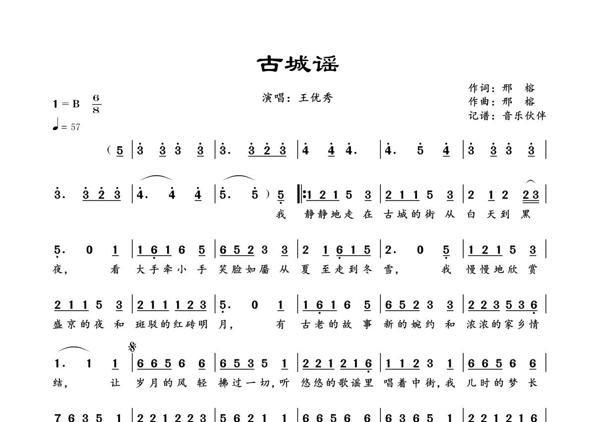《古城谣》是王优秀演唱的一首歌曲,拍号为6/8拍,歌曲速度为每分钟57拍,这份简谱共有一张高清图谱,图谱由 @音乐伙伴 编配上传。