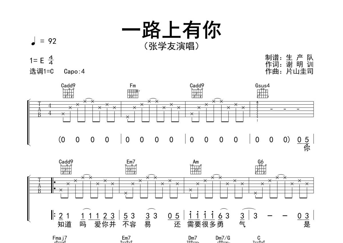 《一路上有你》是张学友演唱的一首歌曲,精编完美版,拍号为4/4拍,歌曲速度为每分钟92拍,歌曲原调为E调,但由于原调指法比较难,为了方便弹奏,本吉他谱采用的是C调指法编配,变调夹4品弹奏即为原调,当然也可以根据自己的音域改变变调夹位置,或者通过改变和弦调性,以方便自己弹奏,这份吉他谱共有三张高清图谱,图谱由 @生产队 编配上传,图谱使用六线谱编配,包含吉他和弦指法、简谱以及歌词部分,使用这份一路上有你吉他谱,可以让你更加方便地掌握这首歌曲的弹唱技巧,快来尝试吧。《一路上有你》是张学友演唱的歌曲,由谢明训作词,片山圭司作曲,收录于张学友1993年3月5日发行的专辑《吻别》,1993年,该曲入围香港电台十大中文金曲奖。本吉他谱根据原版C调指法编配,完整的前奏、间奏、尾奏编配,怀旧经典!。