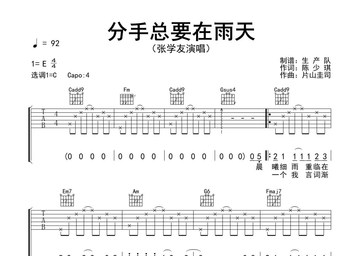 《分手总要在雨天》是张学友演唱的一首歌曲,精编完美版,拍号为4/4拍,歌曲速度为每分钟92拍,歌曲原调为E调,但由于原调指法比较难,为了方便弹奏,本吉他谱采用的是C调指法编配,变调夹4品弹奏即为原调,当然也可以根据自己的音域改变变调夹位置,或者通过改变和弦调性,以方便自己弹奏,这份吉他谱共有三张高清图谱,图谱由 @生产队 编配上传,图谱使用六线谱编配,包含吉他和弦指法、简谱以及歌词部分,使用这份分手总要在雨天吉他谱,可以让你更加方便地掌握这首歌曲的弹唱技巧,快来尝试吧。《分手总要在雨天》是张学友演唱的一首歌曲,由陈少琪作词,片山圭司作曲,卢东尼编曲,收录在张学友1992年5月13日发行的专辑《真情流露》中 。本吉他谱根据原版C调指法编配,完整的前奏、间奏、尾奏编配,致敬经典!。