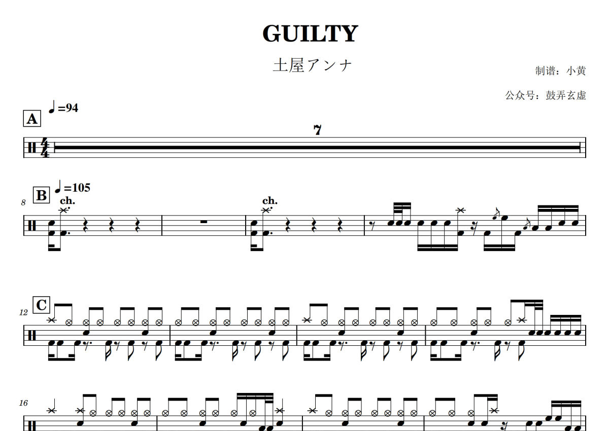 《GUILTY》是土屋アンナ演唱的一首歌曲,拍号为4/4拍,歌曲速度为每分钟105拍,这份架子鼓谱共有四张高清图谱,图谱由 @小黄 编配上传,图谱使用五线谱编配,使用这份GUILTY架子鼓谱,你将能够轻松地敲打出这首土屋アンナ的GUILTY,快来尝试吧。