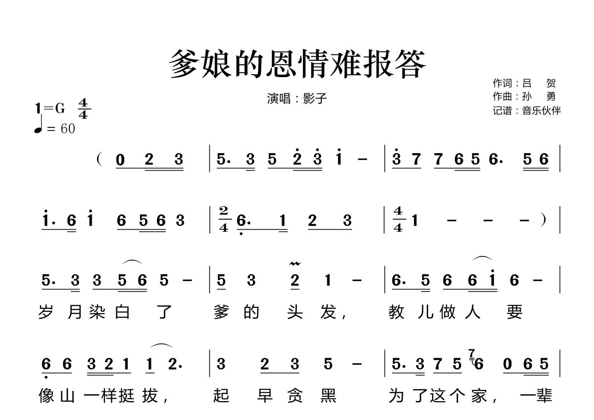 《爹娘的恩情难报答》是影子演唱的一首歌曲,这份简谱共有两张高清图谱,图谱由 @音乐伙伴 编配上传。
