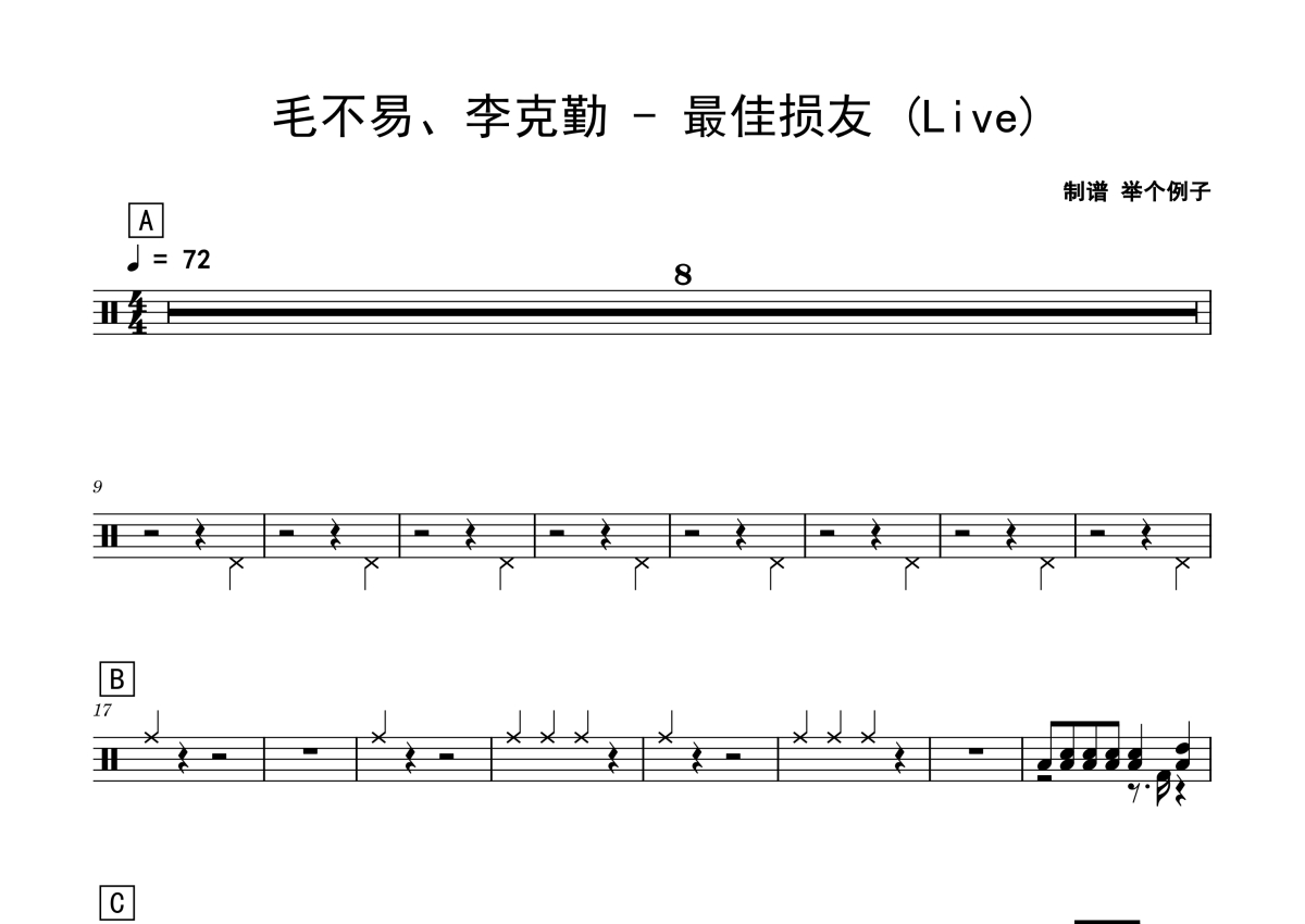 《最佳损友》是毛不易/李克勤演唱的一首歌曲,live,拍号为4/4拍,歌曲速度为每分钟72拍,这份架子鼓谱共有两张高清图谱,图谱由 @Sawubona 编配上传,图谱使用五线谱编配,使用这份最佳损友架子鼓谱,你将能够轻松地敲打出这首毛不易/李克勤的最佳损友,快来尝试吧。