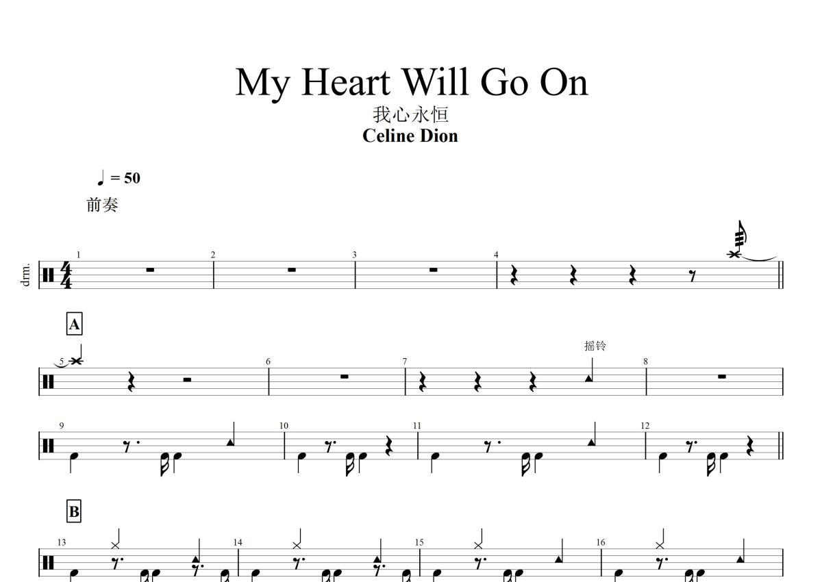 《My Heart Will Go On》是席琳·迪翁演唱的一首歌曲,这份鼓谱共有两张高清图谱,图谱由 @打鼓谱 编配上传,图谱使用五线谱编配,使用这份My Heart Will Go On架子鼓谱,你将能够轻松地敲打出这首席琳·迪翁的My Heart Will Go On,快来尝试吧。《My Heart Will Go On》是加拿大女歌手席琳·迪翁演唱的一首流行歌曲,歌词、曲谱由詹姆斯·霍纳和威尔·詹宁斯编写,后者负责音乐制作 [1] 。该歌曲作为1997年电影《泰坦尼克号》的主题曲 [2] ,于1997年12月8日通过哥伦比亚唱片公司发布,同时也被收录在席琳·迪翁于1997年11月14日发行的第五张英语专辑《Let's Talk About Love》中 [3-4] 。