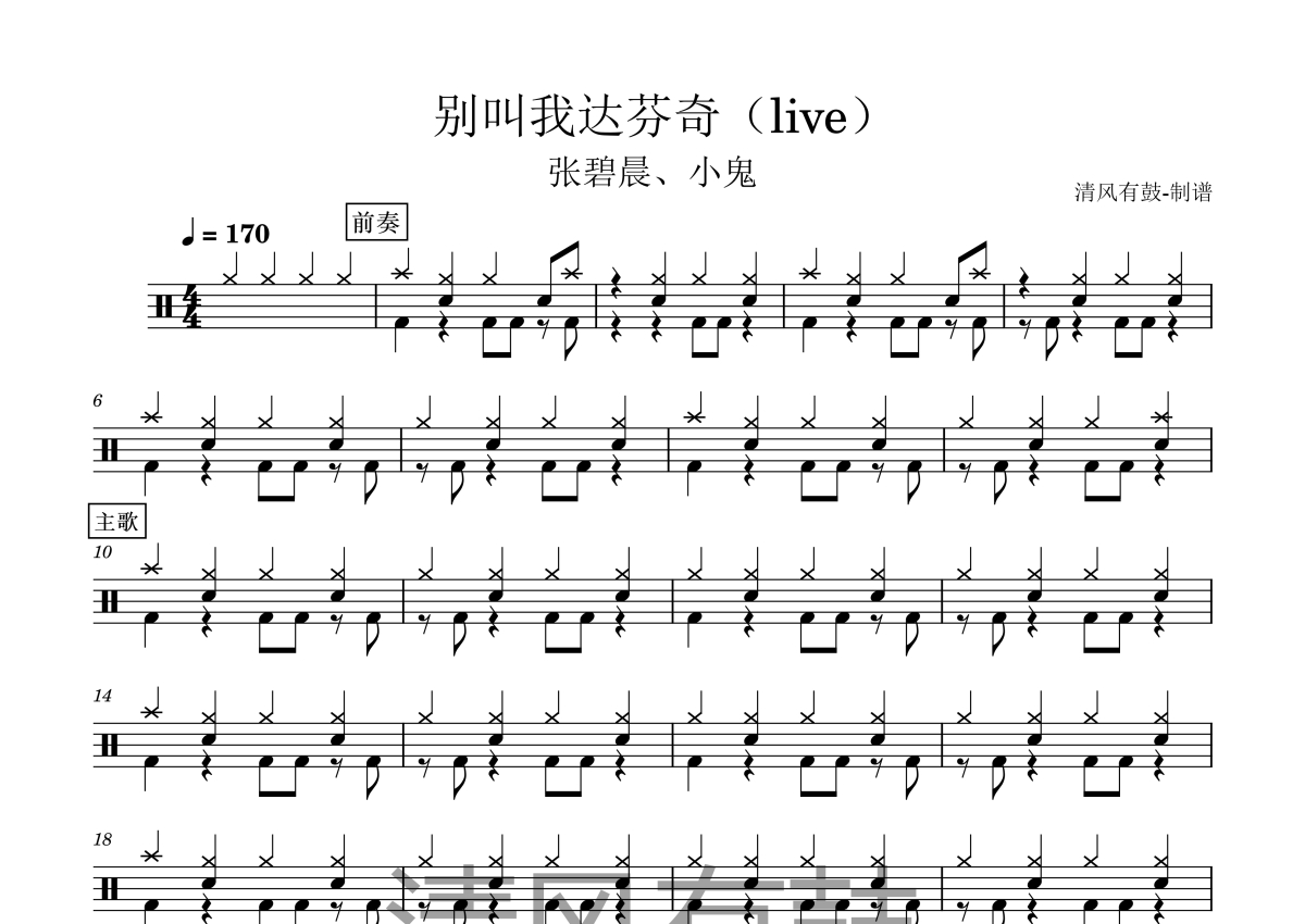 《别叫我达芬奇》是张碧晨演唱的一首歌曲,live,拍号为4/4拍,歌曲速度为每分钟170拍,这份架子鼓谱共有四张高清图谱,图谱由 @王远康 编配上传,图谱使用五线谱编配,使用这份别叫我达芬奇架子鼓谱,你将能够轻松地敲打出这首张碧晨的别叫我达芬奇,快来尝试吧。