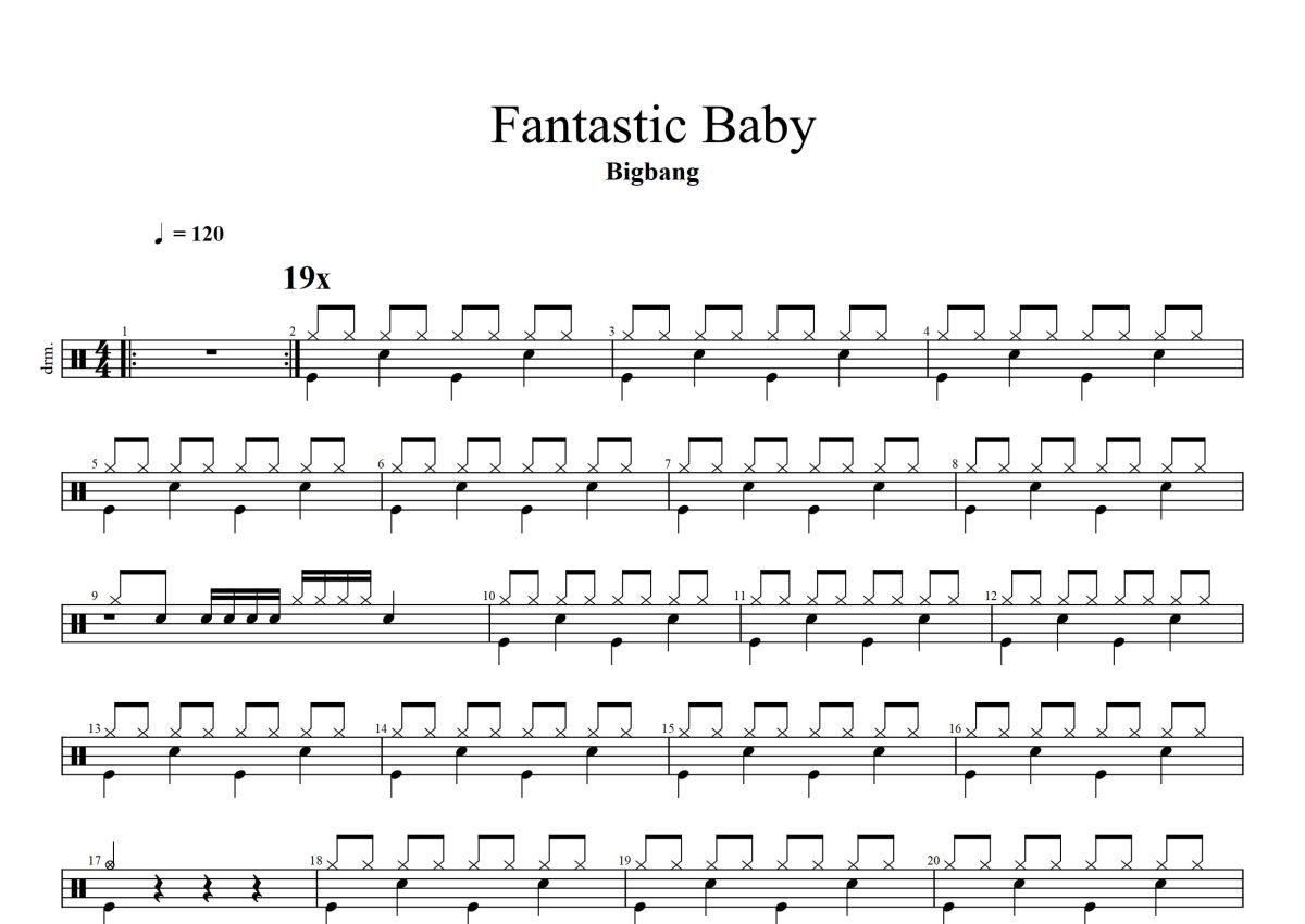 《Fantastic Baby》是Bigbang演唱的一首歌曲,这份鼓谱共有三张高清图谱,图谱由 @打鼓谱 编配上传,图谱使用五线谱编配,使用这份Fantastic Baby架子鼓谱,你将能够轻松地敲打出这首Bigbang的Fantastic Baby,快来尝试吧。《Fantastic Baby》是韩国男团BigBang演唱的歌曲,收录在BIGBANG的迷你5辑《ALIVE》中,于2012年02月29日发行,歌曲的日文版于3月发行。