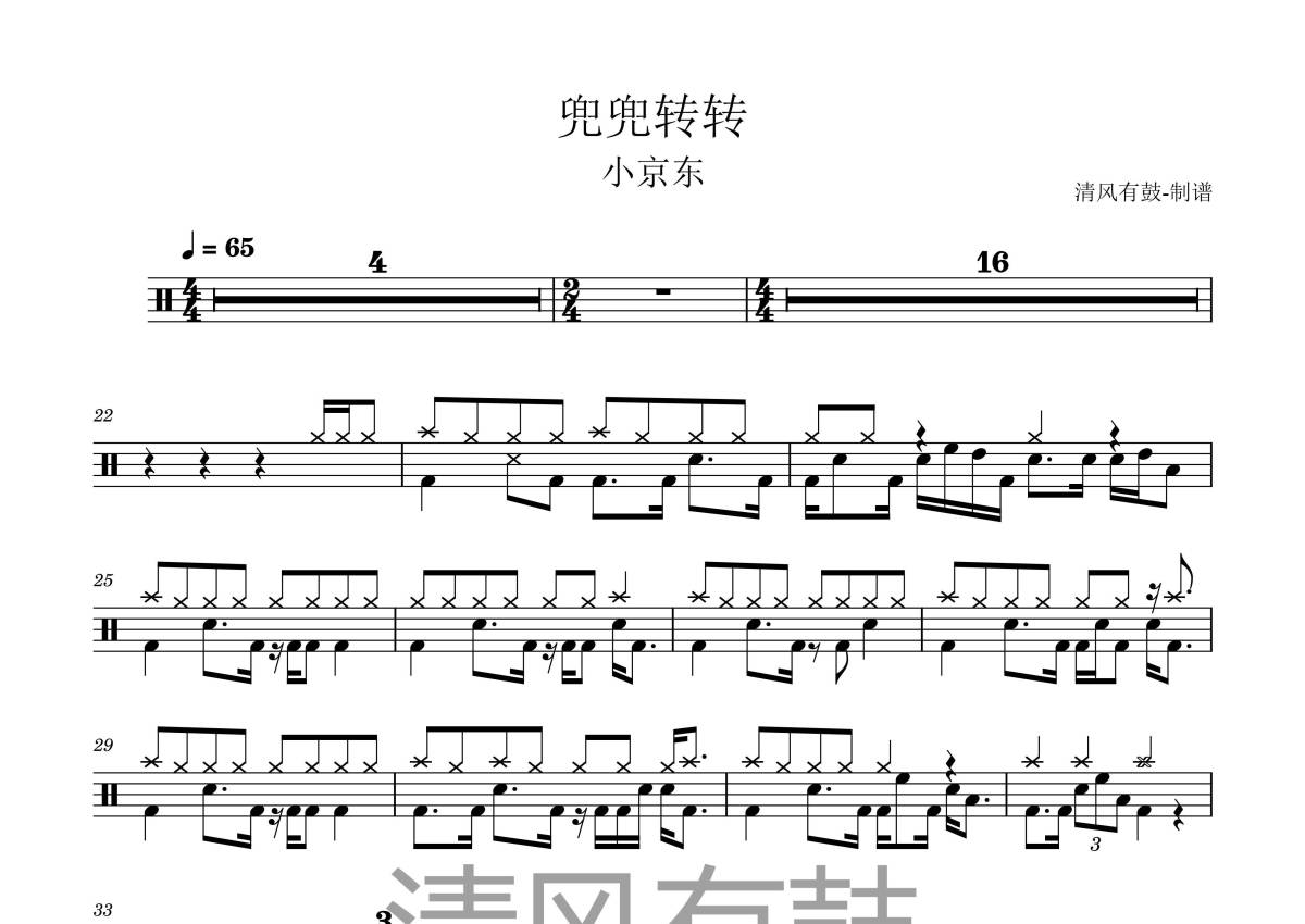 《兜兜转转》是小京东演唱的一首歌曲,拍号为4/4拍,歌曲速度为每分钟65拍,这份架子鼓谱共有一张高清图谱,图谱由 @王远康 编配上传,图谱使用五线谱编配,使用这份兜兜转转架子鼓谱,你将能够轻松地敲打出这首小京东的兜兜转转,快来尝试吧。