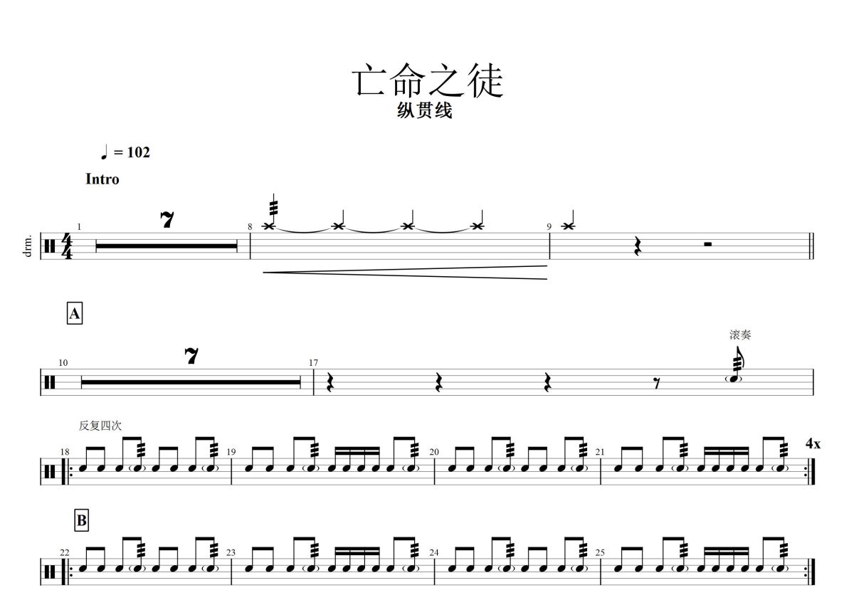 《亡命之徒》是纵贯线乐队演唱的一首歌曲,这份鼓谱共有三张高清图谱,图谱由 @打鼓谱 编配上传,图谱使用五线谱编配,使用这份亡命之徒架子鼓谱,你将能够轻松地敲打出这首纵贯线乐队的亡命之徒,快来尝试吧。《亡命之徒》是由李宗盛、罗大佑与周华健作词,张震岳作曲 [1] ,纵贯线乐队演唱的一首歌曲,该曲于2008年12月17日以单曲的形式发行 [2] ,后收录在纵贯线2009年发行的专辑《北上列车》中 [3] 。该曲也是纵贯线乐队组团后创作的第一支单曲。