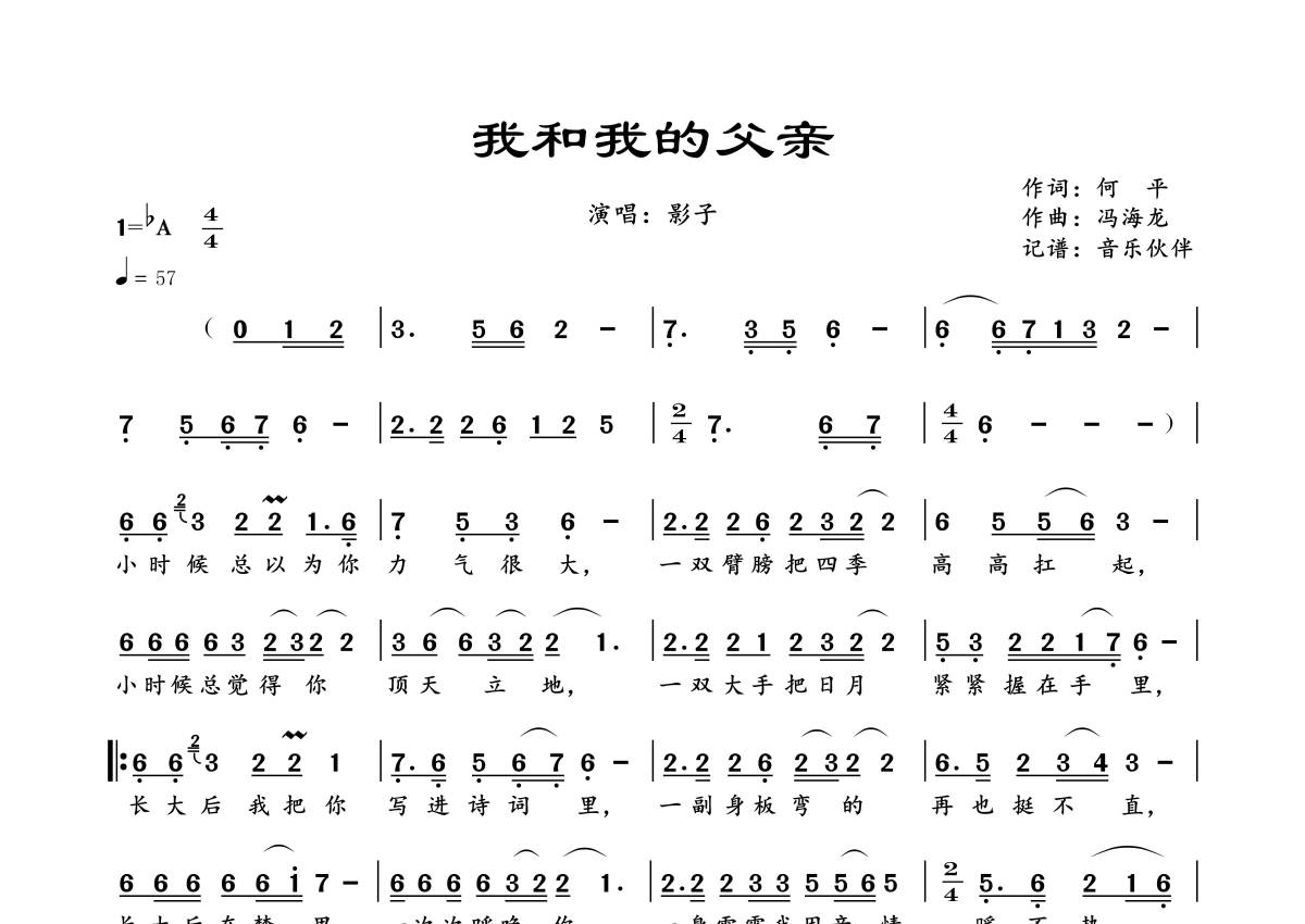 《我和我的父亲》是影子演唱的一首歌曲,拍号为4/4拍,歌曲速度为每分钟57拍,这份简谱共有一张高清图谱,图谱由 @音乐伙伴 编配上传。