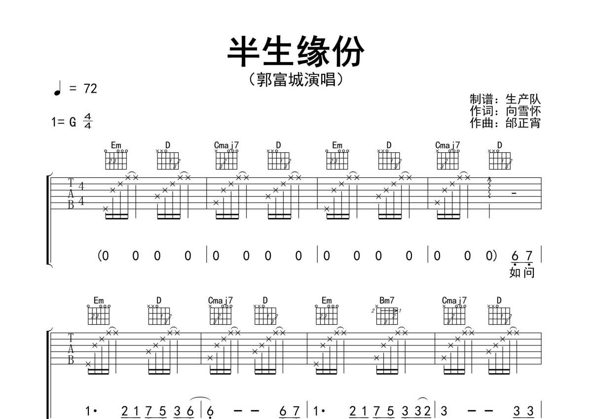 《半生缘份》是郭富城演唱的一首歌曲,精编民谣版,拍号为4/4拍,歌曲速度为每分钟72拍,歌曲原调为G调,本吉他谱采用的是G调指法编配,演奏时不需要使用变调夹即为原调,这份吉他谱共有三张高清图谱,图谱由 @生产队 编配上传,图谱使用六线谱编配,包含吉他和弦指法、简谱以及歌词部分,使用这份半生缘份吉他谱,可以让你更加方便地掌握这首歌曲的弹唱技巧,快来尝试吧。《半生缘份》是由向雪怀作词,邰正宵作曲,郭富城演唱的一首粤语歌曲,所属专辑《铁幕诱惑》。本吉他谱根据原版G调指法编配,完整的前奏、间奏、尾奏编配,怀旧经典!。