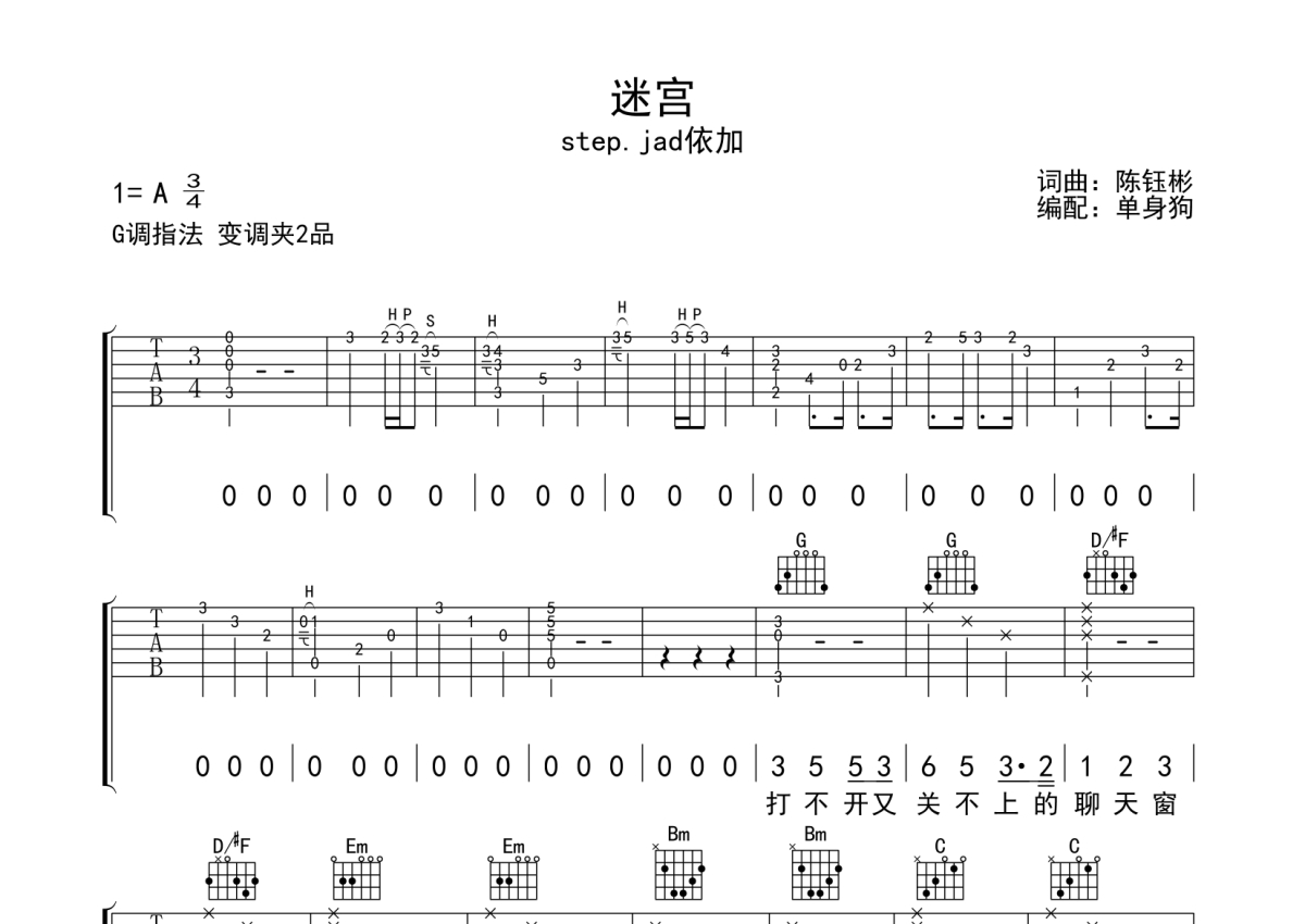 《迷宫》是step.jad依加演唱的一首歌曲,拍号为3/4拍,歌曲原调为A调,但由于原调指法比较难,为了方便弹奏,本吉他谱采用的是G调指法编配,变调夹2品弹奏即为原调,当然也可以根据自己的音域改变变调夹位置,或者通过改变和弦调性,以方便自己弹奏,这份吉他谱共有三张高清图谱,图谱由 @单身狗 编配上传,图谱使用六线谱编配,包含吉他和弦指法、简谱以及歌词部分,使用这份迷宫吉他谱,可以让你更加方便地掌握这首歌曲的弹唱技巧,快来尝试吧。