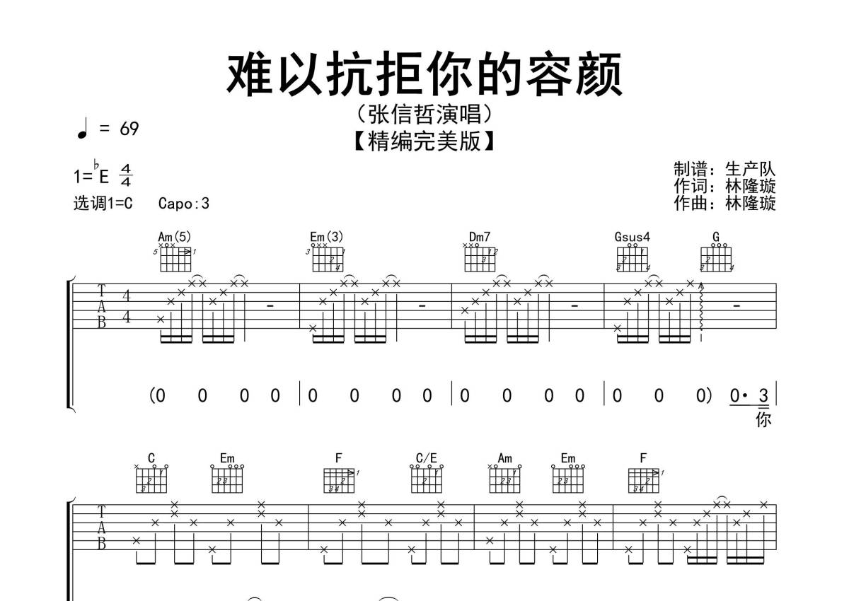 《难以抗拒你的容颜》是张信哲演唱的一首歌曲,精编完美版,拍号为4/4拍,歌曲速度为每分钟69拍,歌曲原调为Eb调,但由于原调指法比较难,为了方便弹奏,本吉他谱采用的是C调指法编配,变调夹3品弹奏即为原调,当然也可以根据自己的音域改变变调夹位置,或者通过改变和弦调性,以方便自己弹奏,这份吉他谱共有三张高清图谱,图谱由 @生产队 编配上传,图谱使用六线谱编配,包含吉他和弦指法、简谱以及歌词部分,使用这份难以抗拒你的容颜吉他谱,可以让你更加方便地掌握这首歌曲的弹唱技巧,快来尝试吧。《难以抗拒你容颜》是张信哲演唱的歌曲,由林隆璇填词,林隆璇谱曲,收录在专辑《知道》中,该曲也是电视剧《邮差总按三次铃》的片尾曲。本吉他谱根据原版C调指法编配,完整的前奏、间奏、尾奏编配,精编完美版,致敬经典!。