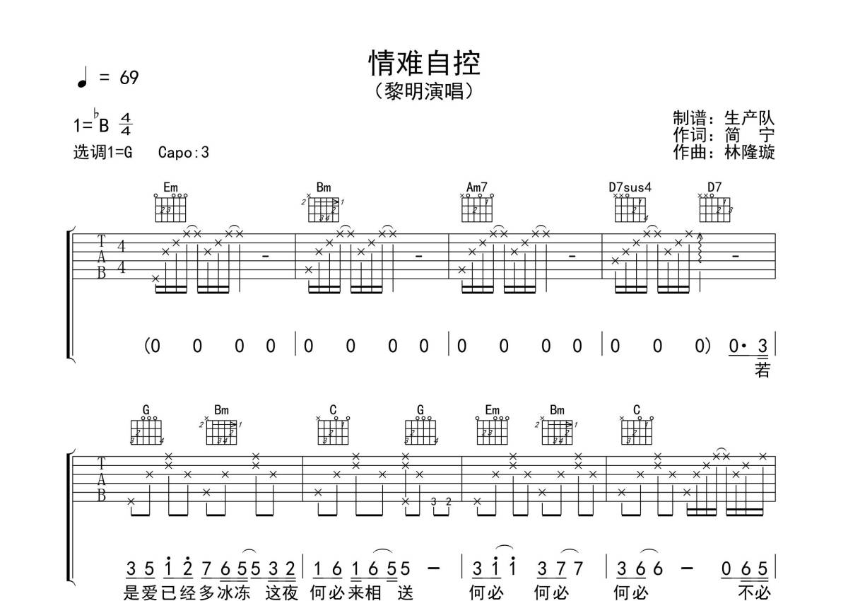 《情难自控》是黎明演唱的一首歌曲,精编完美版,拍号为4/4拍,歌曲速度为每分钟69拍,歌曲原调为Bb调,但由于原调指法比较难,为了方便弹奏,本吉他谱采用的是G调指法编配,变调夹3品弹奏即为原调,当然也可以根据自己的音域改变变调夹位置,或者通过改变和弦调性,以方便自己弹奏,这份吉他谱共有三张高清图谱,图谱由 @生产队 编配上传,图谱使用六线谱编配,包含吉他和弦指法、简谱以及歌词部分,使用这份情难自控吉他谱,可以让你更加方便地掌握这首歌曲的弹唱技巧,快来尝试吧。《情难自控》是由林隆璇作曲,简宁作词,黎明演唱的一首粤语歌曲,收录于1992年发行的专辑《I Love U OK》中。本吉他谱根据原版G调指法编配,完整的前奏、间奏、尾奏编配,精编完美版,怀旧经典!。