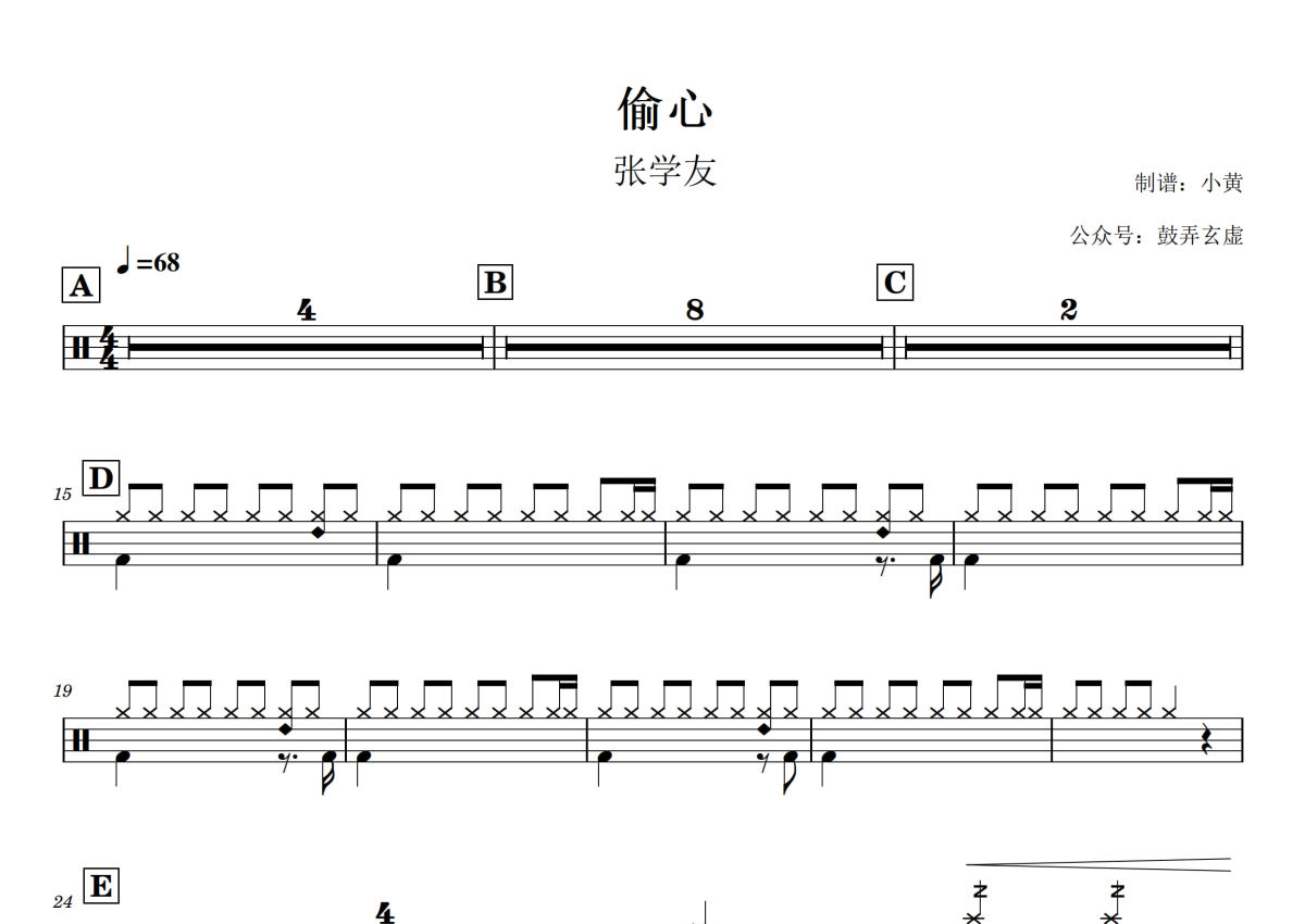 《偷心》是张学友演唱的一首歌曲,拍号为4/4拍,歌曲速度为每分钟68拍,这份架子鼓谱共有两张高清图谱,图谱由 @小黄 编配上传,图谱使用五线谱编配,使用这份偷心架子鼓谱,你将能够轻松地敲打出这首张学友的偷心,快来尝试吧。