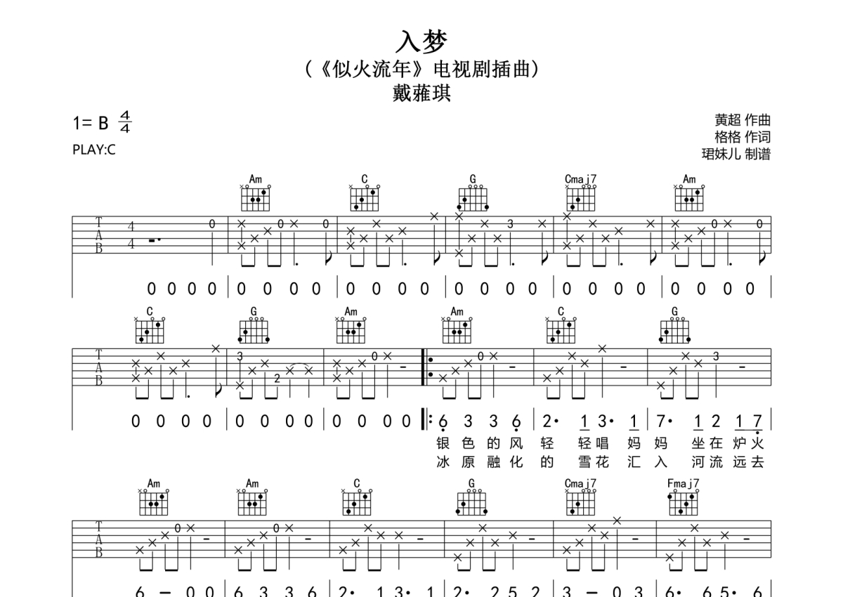 戴蕥琪《入梦》吉他谱 - C调弹唱六线谱
