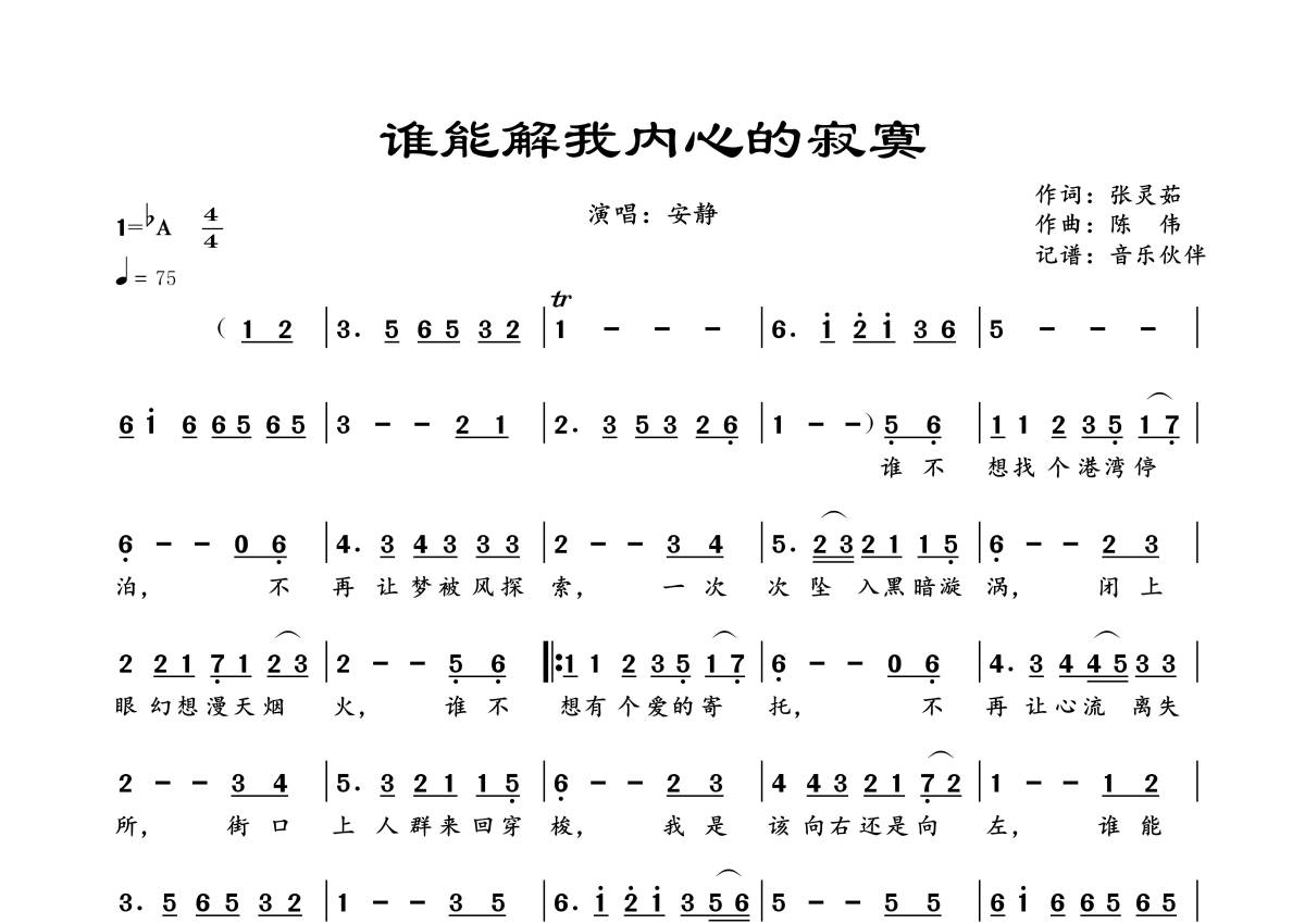 《谁能解我内心的寂寞》是安静演唱的一首歌曲,拍号为4/4拍,歌曲速度为每分钟75拍,这份简谱共有一张高清图谱,图谱由 @音乐伙伴 编配上传。