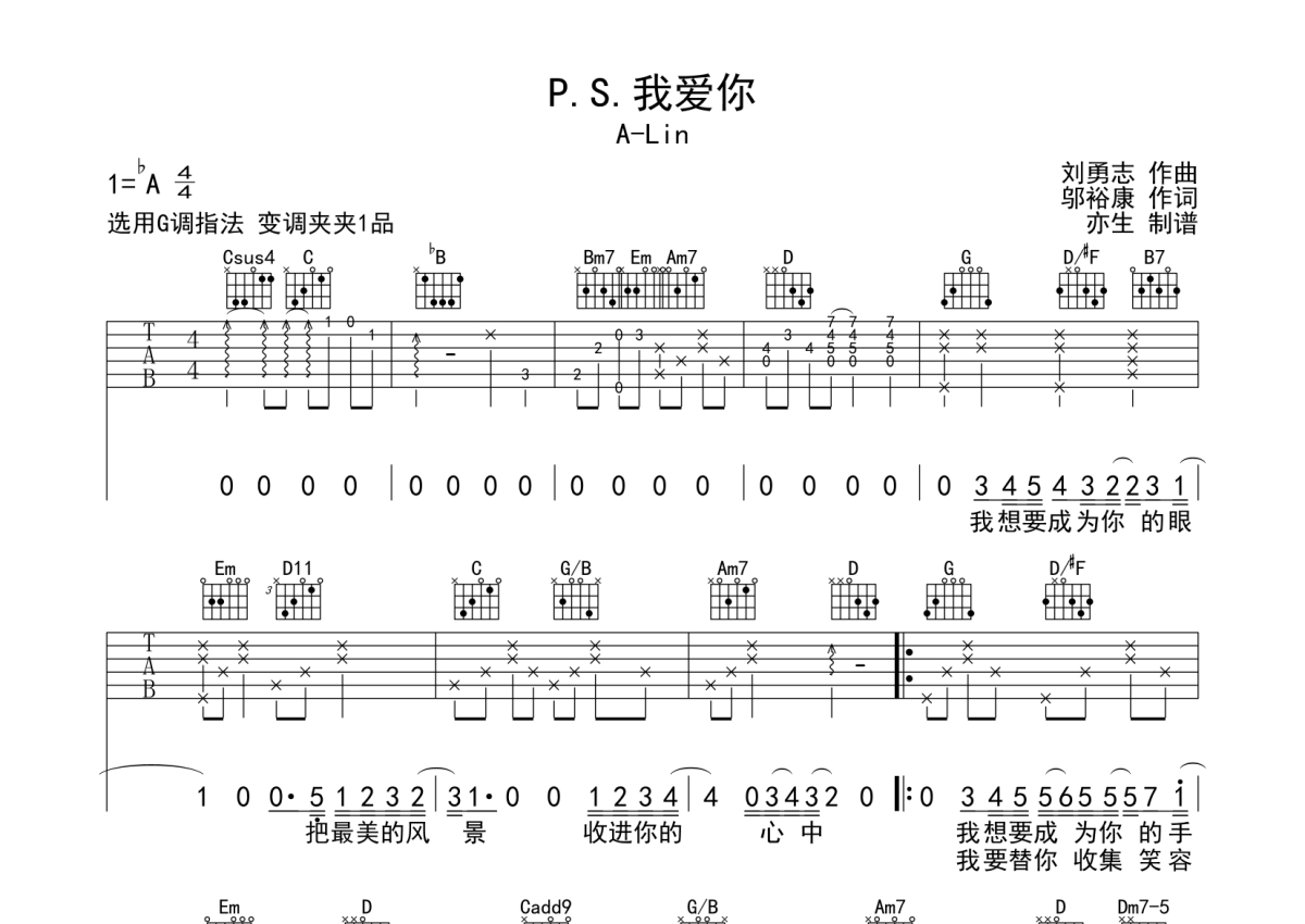 《P.S.我爱你》是A-Lin演唱的一首歌曲,拍号为4/4拍,歌曲原调为Ab调,但由于原调指法比较难,为了方便弹奏,本吉他谱采用的是G调指法编配,变调夹1品弹奏即为原调,当然也可以根据自己的音域改变变调夹位置,或者通过改变和弦调性,以方便自己弹奏,这份吉他谱共有三张高清图谱,图谱由 @亦生 编配上传,图谱使用六线谱编配,包含吉他和弦指法、简谱以及歌词部分,使用这份P.S.我爱你吉他谱,可以让你更加方便地掌握这首歌曲的弹唱技巧,快来尝试吧。
