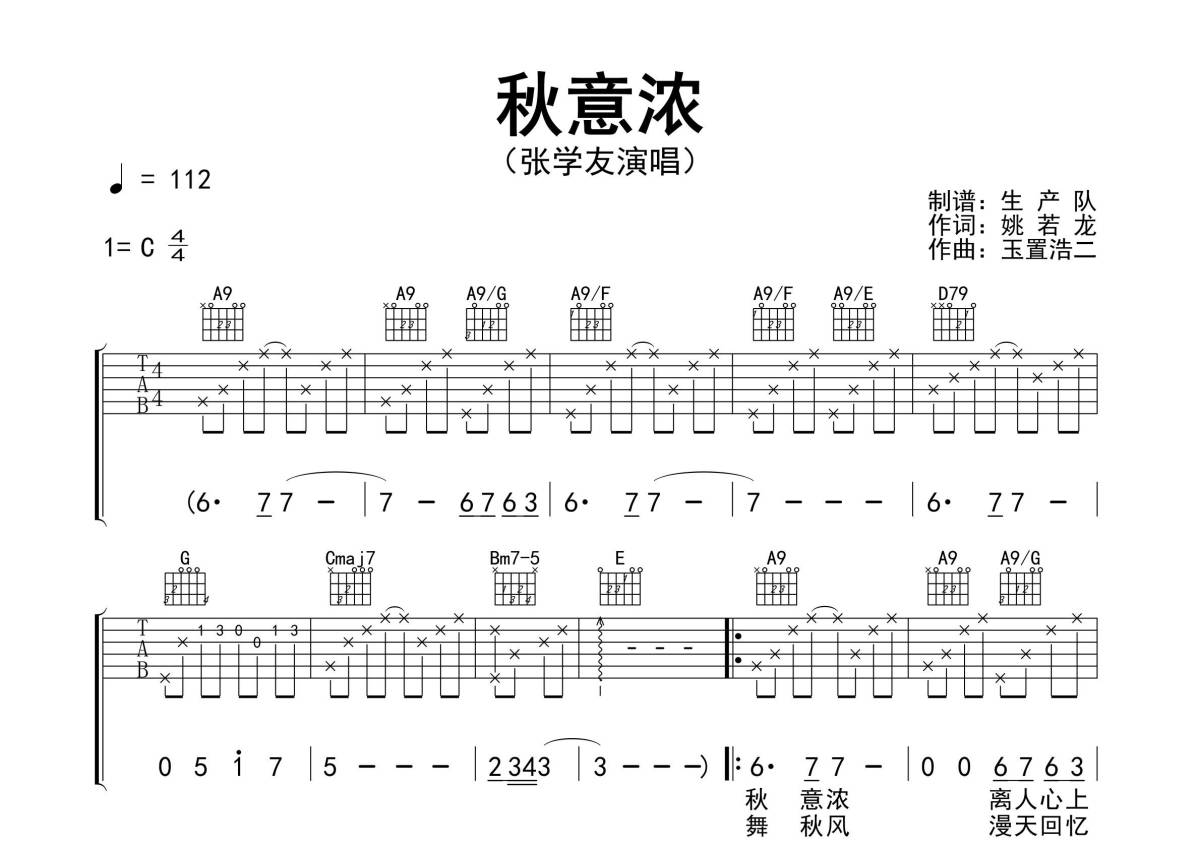 《秋意浓》是张学友演唱的一首歌曲,精编完美版,拍号为4/4拍,歌曲速度为每分钟112拍,歌曲原调为C调,本吉他谱采用的是C调指法编配,演奏时不需要使用变调夹即为原调,这份吉他谱共有两张高清图谱,图谱由 @生产队 编配上传,图谱使用六线谱编配,包含吉他和弦指法、简谱以及歌词部分,使用这份秋意浓吉他谱,可以让你更加方便地掌握这首歌曲的弹唱技巧,快来尝试吧。《秋意浓》是张学友演唱的歌曲,由玉置浩二作曲,姚若龙填词,杜自持编曲,收录在张学友1993年3月5日由宝丽金唱片发行的普通话专辑《吻别》中。本吉他谱根据C调指法编配,致敬经典!。