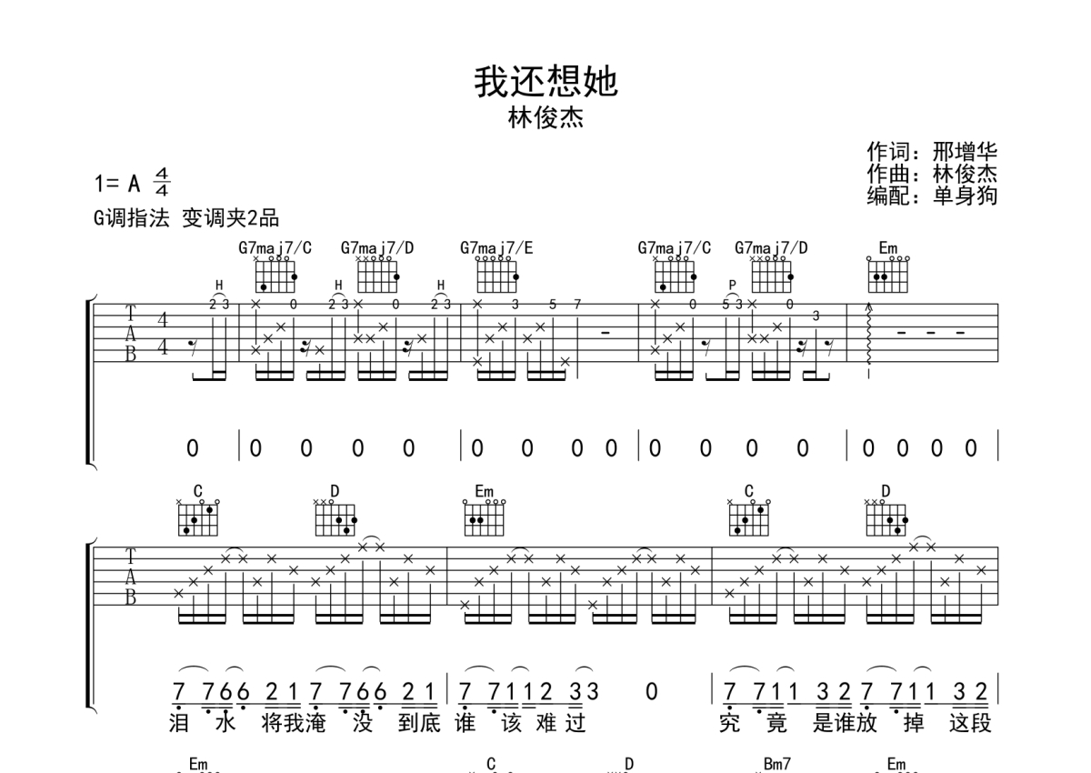《我还想她》是林俊杰演唱的一首歌曲,拍号为4/4拍,歌曲原调为A调,但由于原调指法比较难,为了方便弹奏,本吉他谱采用的是G调指法编配,变调夹2品弹奏即为原调,当然也可以根据自己的音域改变变调夹位置,或者通过改变和弦调性,以方便自己弹奏,这份吉他谱共有三张高清图谱,图谱由 @单身狗 编配上传,图谱使用六线谱编配,包含吉他和弦指法、简谱以及歌词部分,使用这份我还想她吉他谱,可以让你更加方便地掌握这首歌曲的弹唱技巧,快来尝试吧。