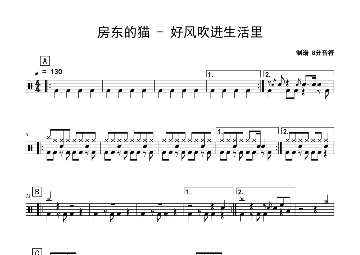 《好风吹进生活里》是房东的猫演唱的一首歌曲,这份架子鼓谱共有两张高清图谱,图谱由 @Sawubona 编配上传,图谱使用五线谱编配,使用这份好风吹进生活里架子鼓谱,你将能够轻松地敲打出这首房东的猫的好风吹进生活里,快来尝试吧。