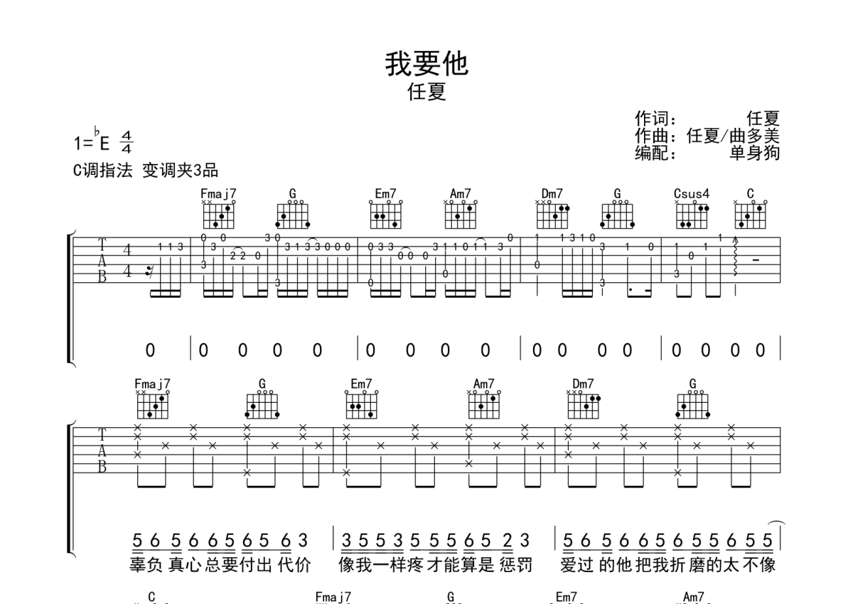 《我要他》是任夏演唱的一首歌曲,拍号为4/4拍,歌曲原调为Eb调,但由于原调指法比较难,为了方便弹奏,本吉他谱采用的是C调指法编配,变调夹3品弹奏即为原调,当然也可以根据自己的音域改变变调夹位置,或者通过改变和弦调性,以方便自己弹奏,这份吉他谱共有三张高清图谱,图谱由 @单身狗 编配上传,图谱使用六线谱编配,包含吉他和弦指法、简谱以及歌词部分,使用这份我要他吉他谱,可以让你更加方便地掌握这首歌曲的弹唱技巧,快来尝试吧。