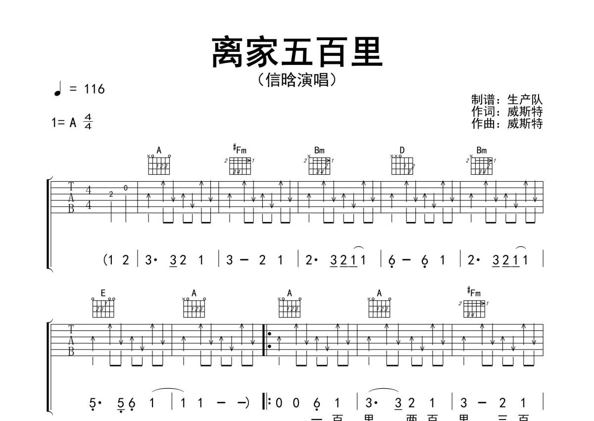 《离家五百里》是信晗演唱的一首歌曲,精编完美版,拍号为4/4拍,歌曲速度为每分钟116拍,歌曲原调为A调,但由于原调指法比较难,为了方便弹奏,本吉他谱采用的是A调指法编配,演奏时不需要使用变调夹即为原调,这份吉他谱共有三张高清图谱,图谱由 @生产队 编配上传,图谱使用六线谱编配,包含吉他和弦指法、简谱以及歌词部分,使用这份离家五百里吉他谱,可以让你更加方便地掌握这首歌曲的弹唱技巧,快来尝试吧。《离家五百里》是由信晗演唱的一首经典乡村民谣歌曲。本吉他谱根据原版A调指法编配,精准的前奏、间奏、尾奏及SOLO编配,怀旧经典!。