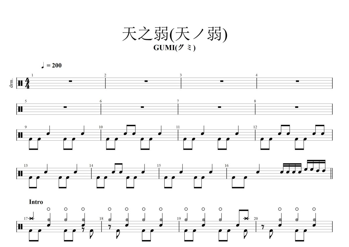 《天之弱》是GUMI演唱的一首歌曲,这份鼓谱共有四张高清图谱,图谱由 @打鼓谱 编配上传,图谱使用五线谱编配,使用这份天之弱架子鼓谱,你将能够轻松地敲打出这首GUMI的天之弱,快来尝试吧。《天之弱》是虚拟歌手GUMI演唱的一首歌曲,由164作词、作曲,于2011年05月28日投稿至日本视频网站niconico动画,拥有超过500万次的播放数 [1] 。 2011年12月4日播放百万达成,也是164的第一个百万曲。