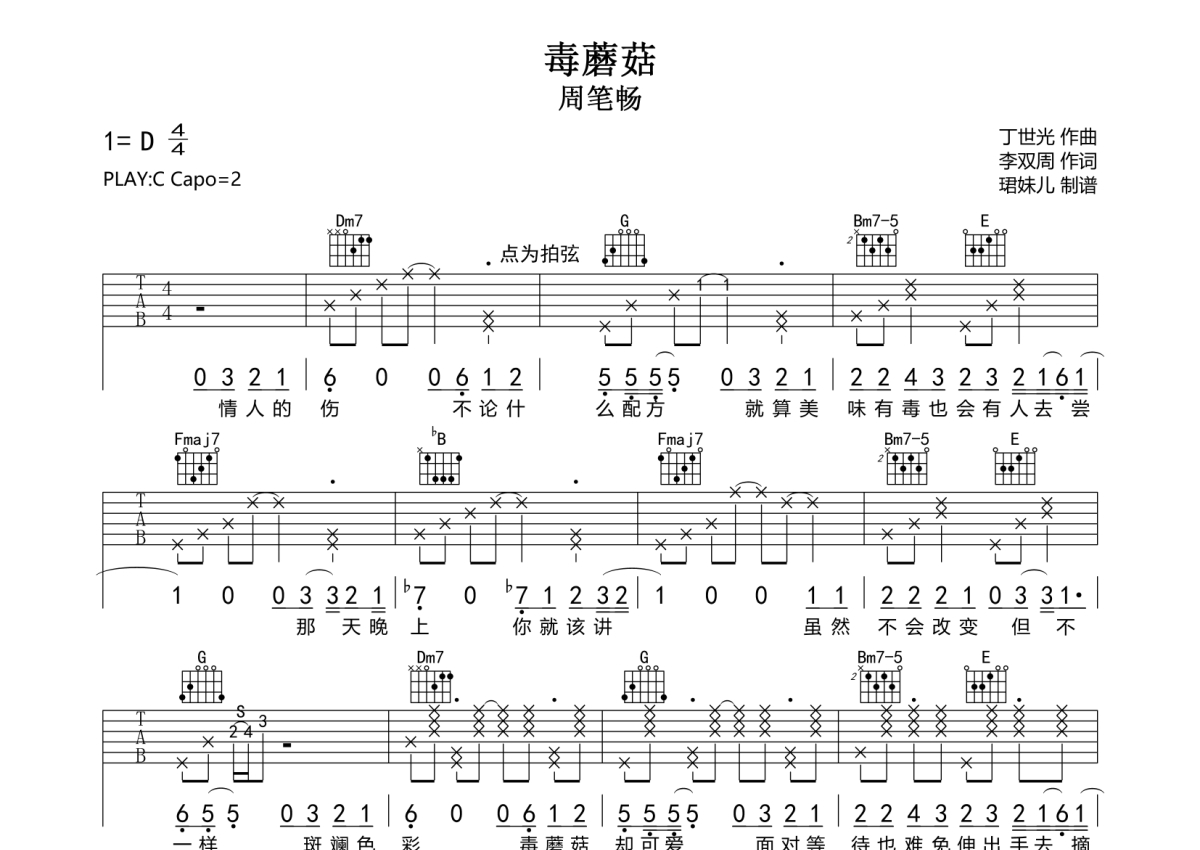 《毒蘑菇》是周笔畅演唱的一首歌曲,拍号为4/4拍,歌曲速度为每分钟85拍,歌曲原调为D调,但由于原调指法比较难,为了方便弹奏,本吉他谱采用的是C调指法编配,变调夹2品弹奏即为原调,当然也可以根据自己的音域改变变调夹位置,或者通过改变和弦调性,以方便自己弹奏,这份吉他谱共有两张高清图谱,图谱由 @珺妹儿 编配上传,图谱使用六线谱编配,包含吉他和弦指法、简谱以及歌词部分,使用这份毒蘑菇吉他谱,可以让你更加方便地掌握这首歌曲的弹唱技巧,快来尝试吧。
